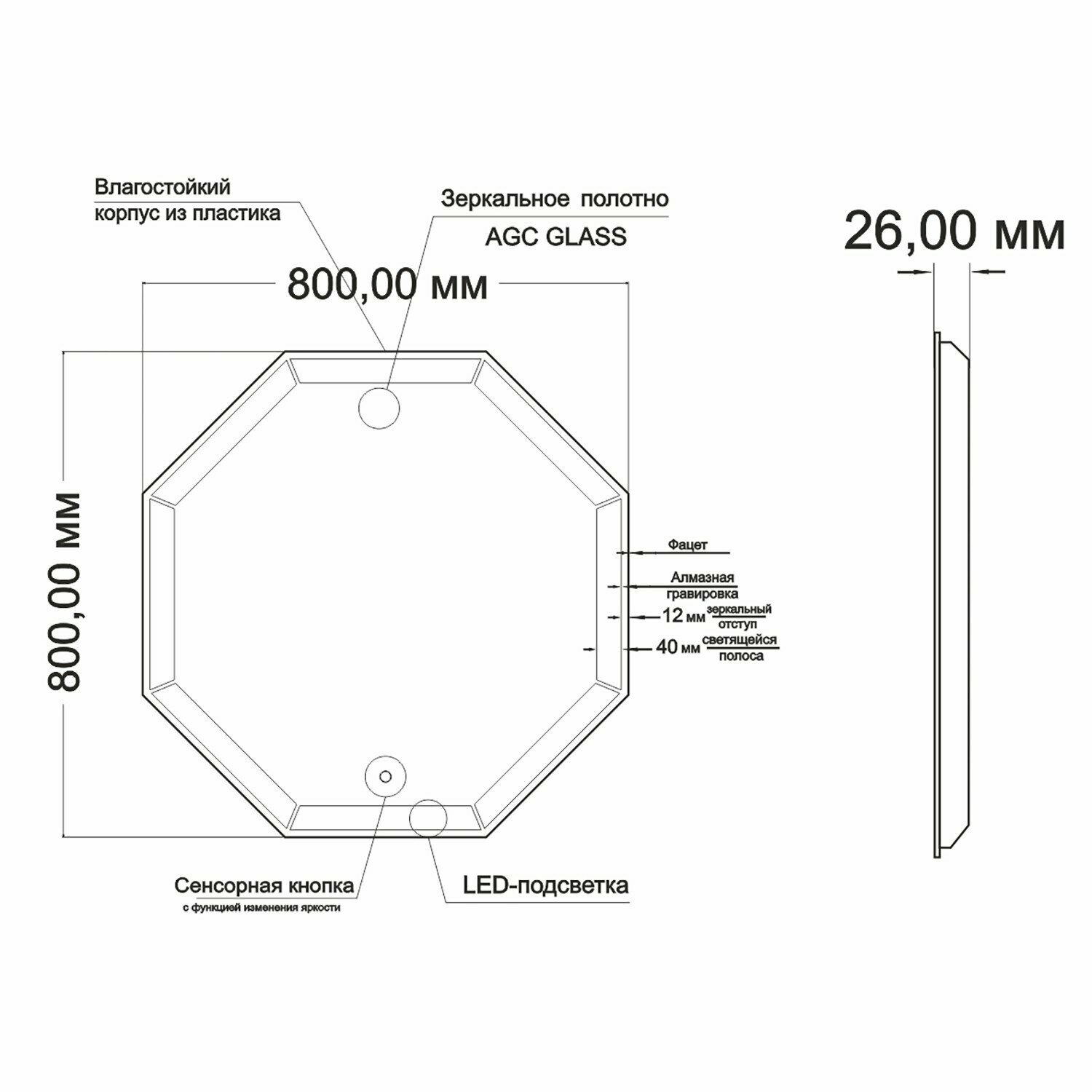 | Особенности | подсветка, регулировка яркости подсветки, с фацетом, сенсорный выключатель подсветки |