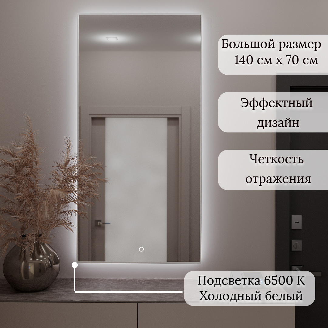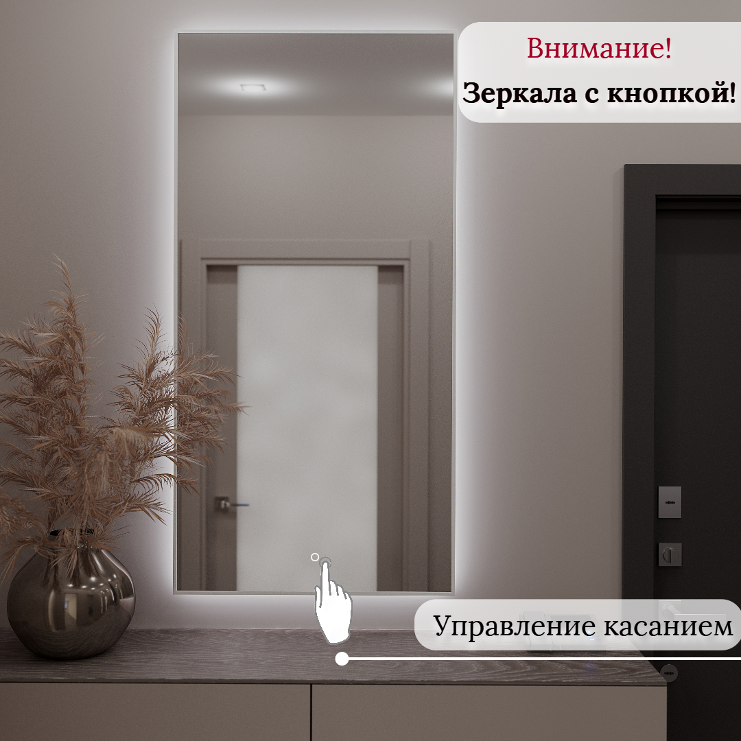 Зеркало настенное для ванной КерамаМане 70*100 см с холодной подсветкой 6000 К с сенсорной кнопкой