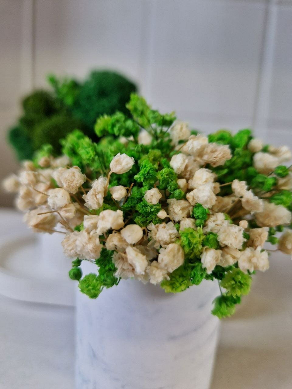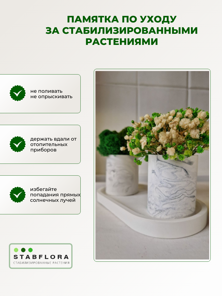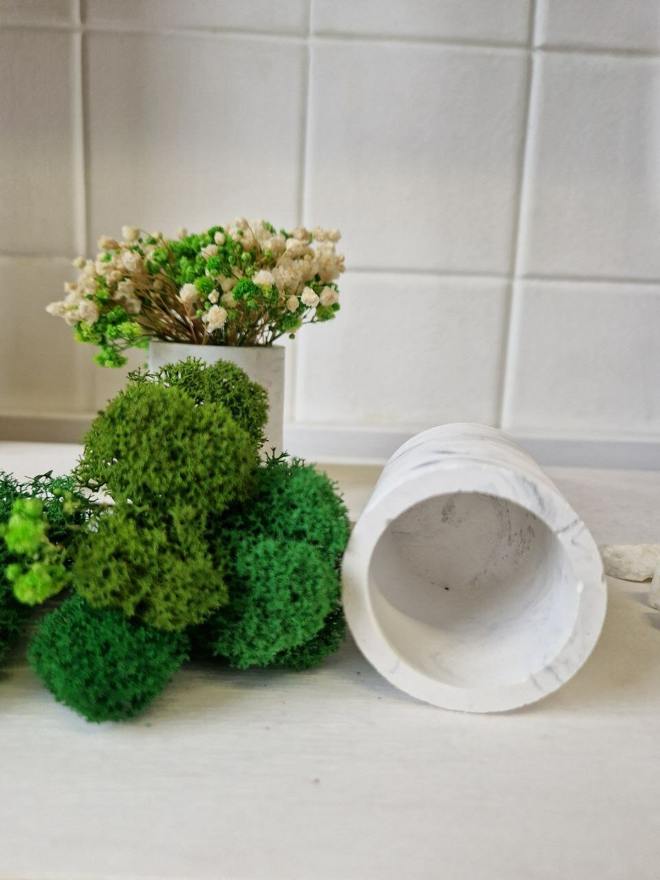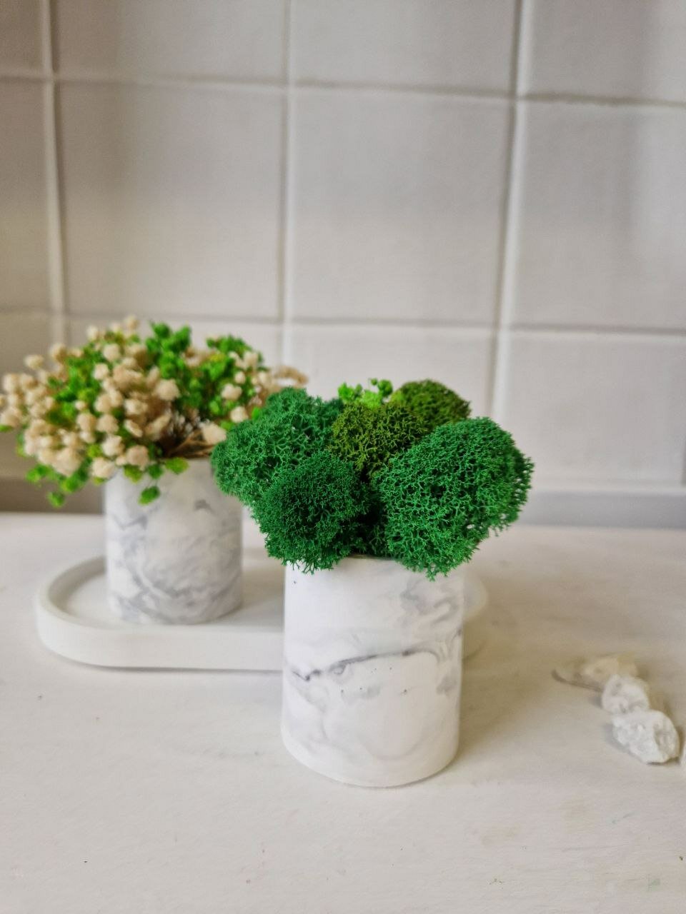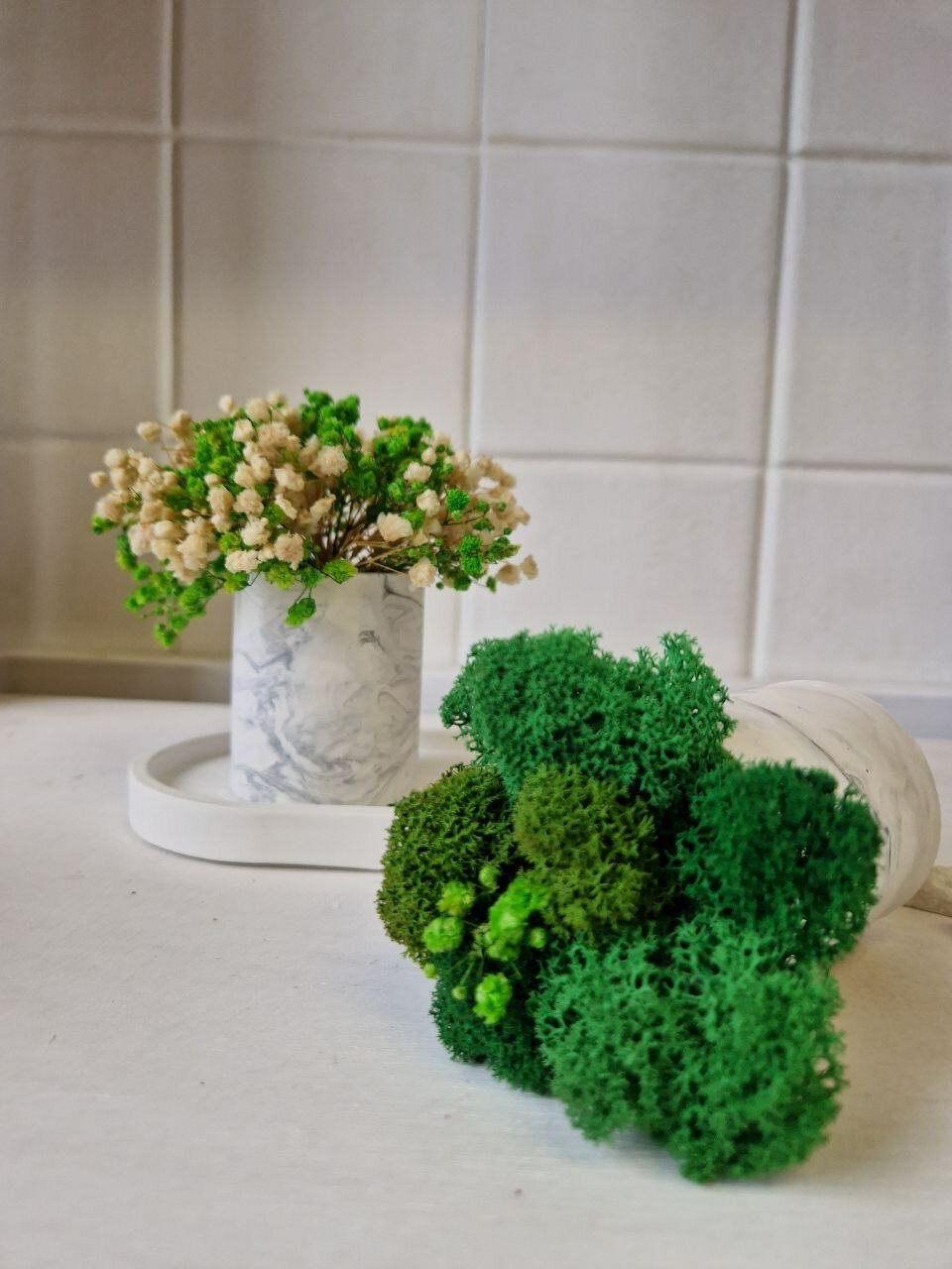 | Дополнительная информация | Декоративный мох в кашпо из гипса 2 шт с подносом, мох в белом кашпо 2 шт на подносе, кашпо со стабилизированным мхом и гипсофилой Stabflora набор 3 штуки |