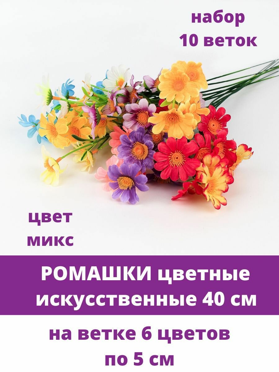 Купить Ромашки искусственные, цветные, на ветке 6 голов, 40 см, набор 10 веток. Цвет микс