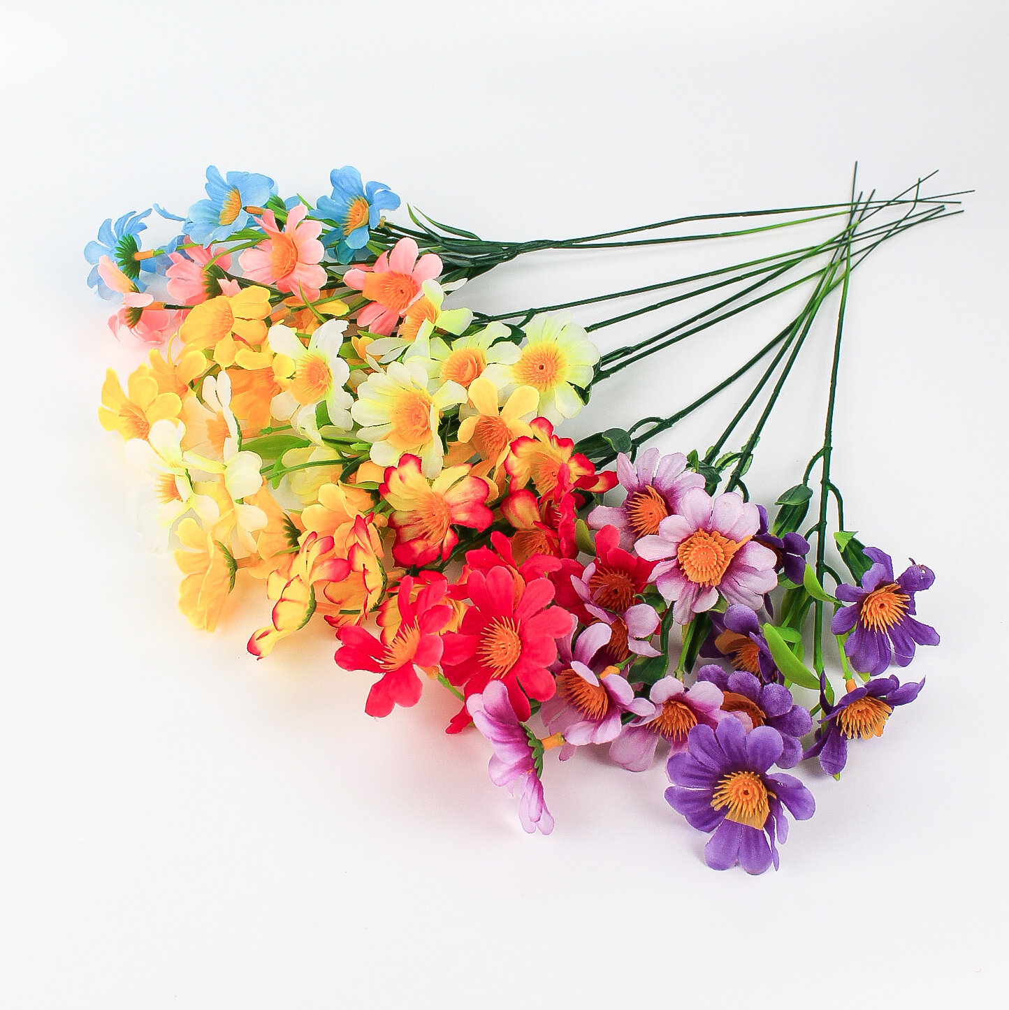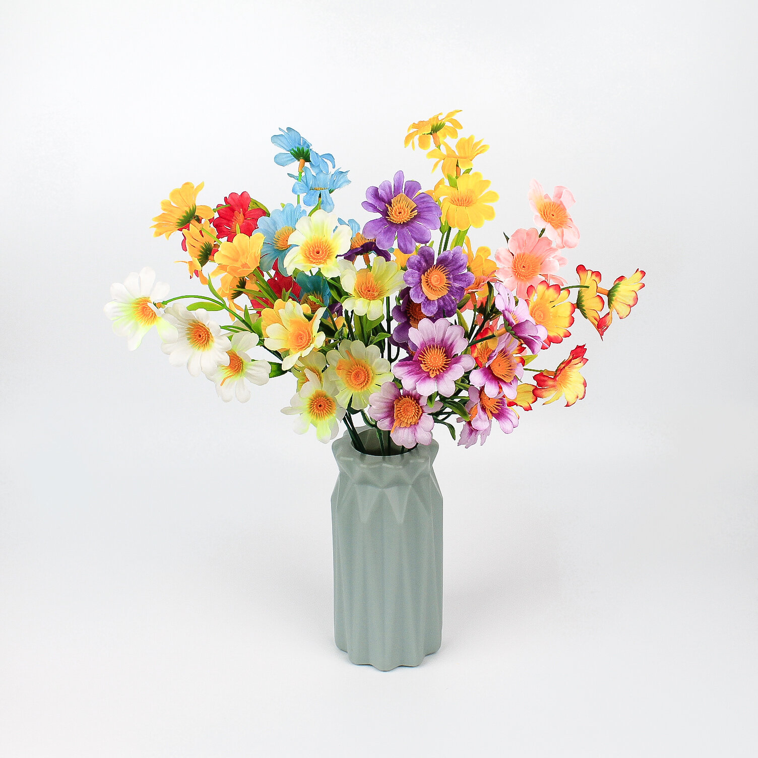 Ромашки искусственные, цветные, на ветке 7 голов, 26 см, набор 5 веток. Цвет микс