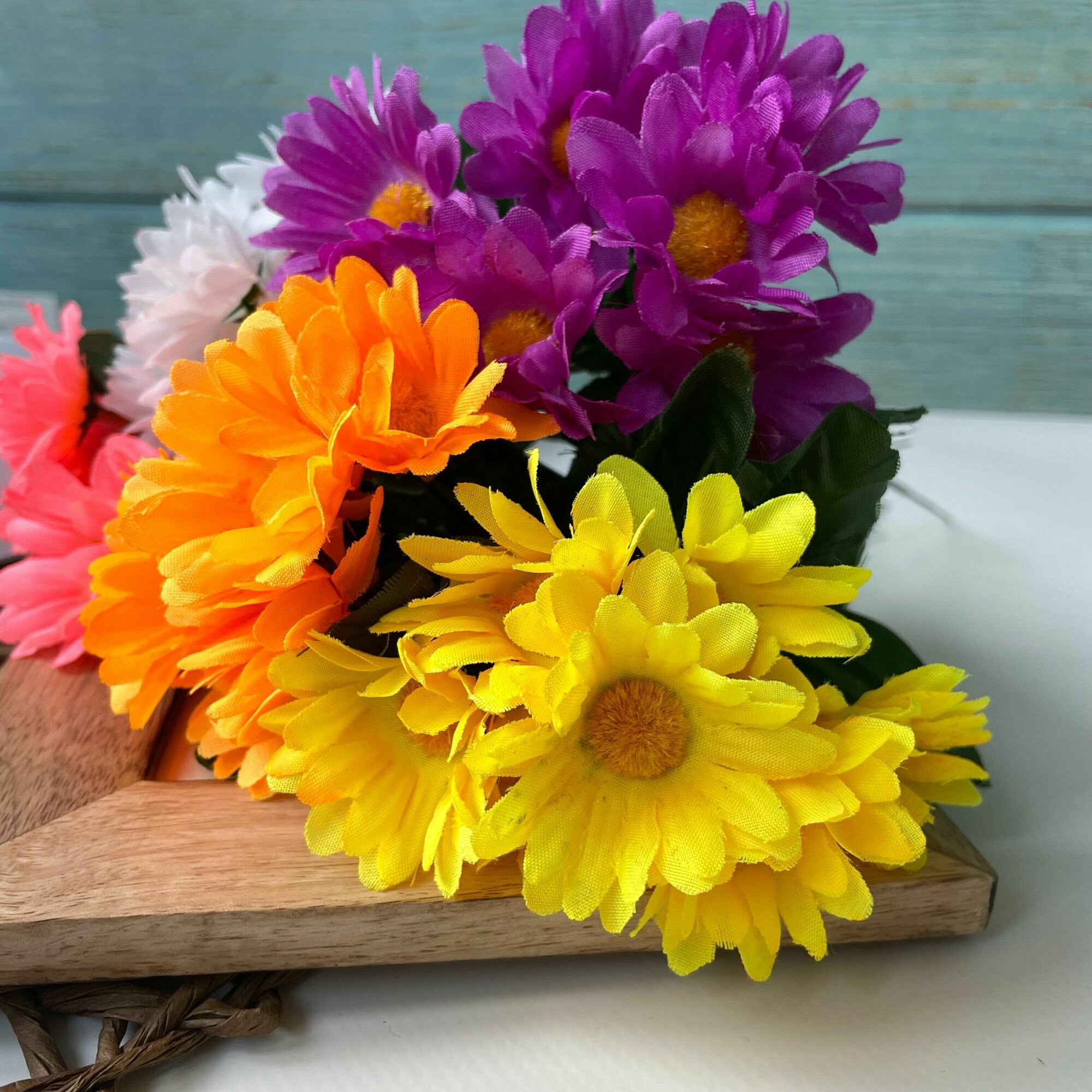 Купить Ромашки искусственные, цветные, на ветке 7 голов, 26 см, набор 5 веток. Цвет микс