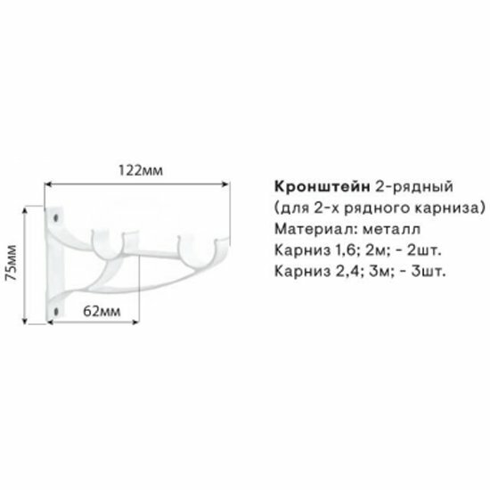 | Комплектация | штанга — 2 шт, кронштейн (металл) — 2 шт, наконечники — 2 шт, заглушка — 2 шт, кольцо для штор — 40 шт, крючок для кольца — 40 шт, комплект креплений |