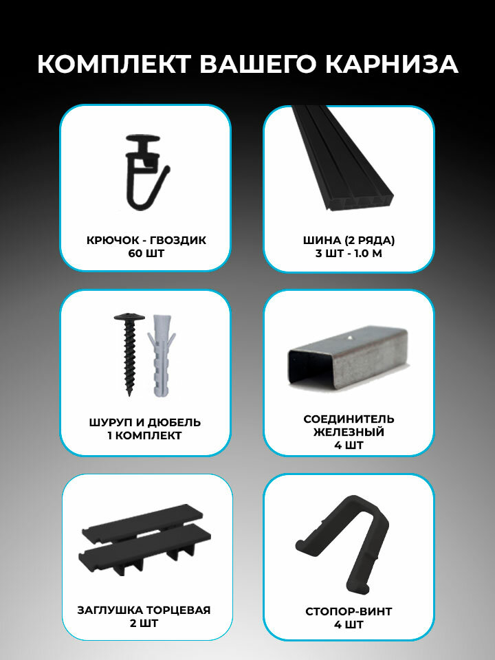 | Комплектация | 1) Крючки с замком. Обеспечивают фиксацию шторы и бесшумное скольжение по направляющим карниза. А так же стирку штор без снятия. Количество идет из расчета 10 шт на метр погонный на каждый ряд. 2) Стопоры винтовые. Ограничивают движение шторы по направляющим, а также предотвращает выпадение крючков. 3) Монтажный комплект (дюбели, саморезы). 4) Соединители |
