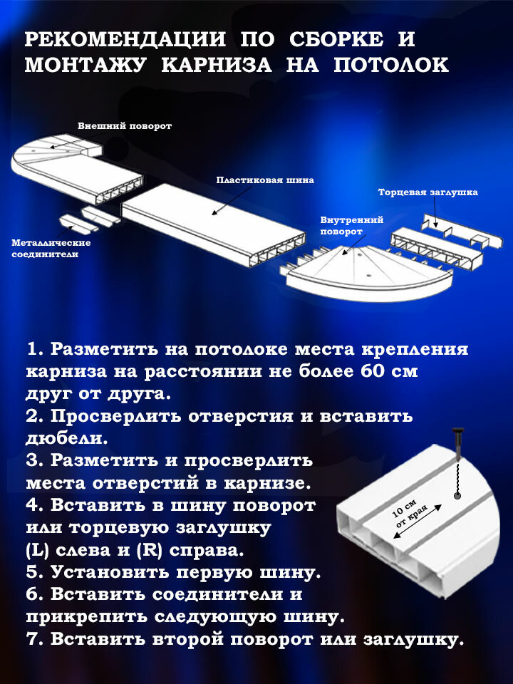 | Комплектация | 1) Крючки с замком. Обеспечивают фиксацию шторы и бесшумное скольжение по направляющим карниза. А так же стирку штор без снятия. Количество идет из расчета 10 шт на метр погонный на каждый ряд. 2) Стопоры винтовые. Ограничивают движение шторы по направляющим, а также предотвращает выпадение крючков. 3) Монтажный комплект (дюбели, саморезы). 4) Соединители |