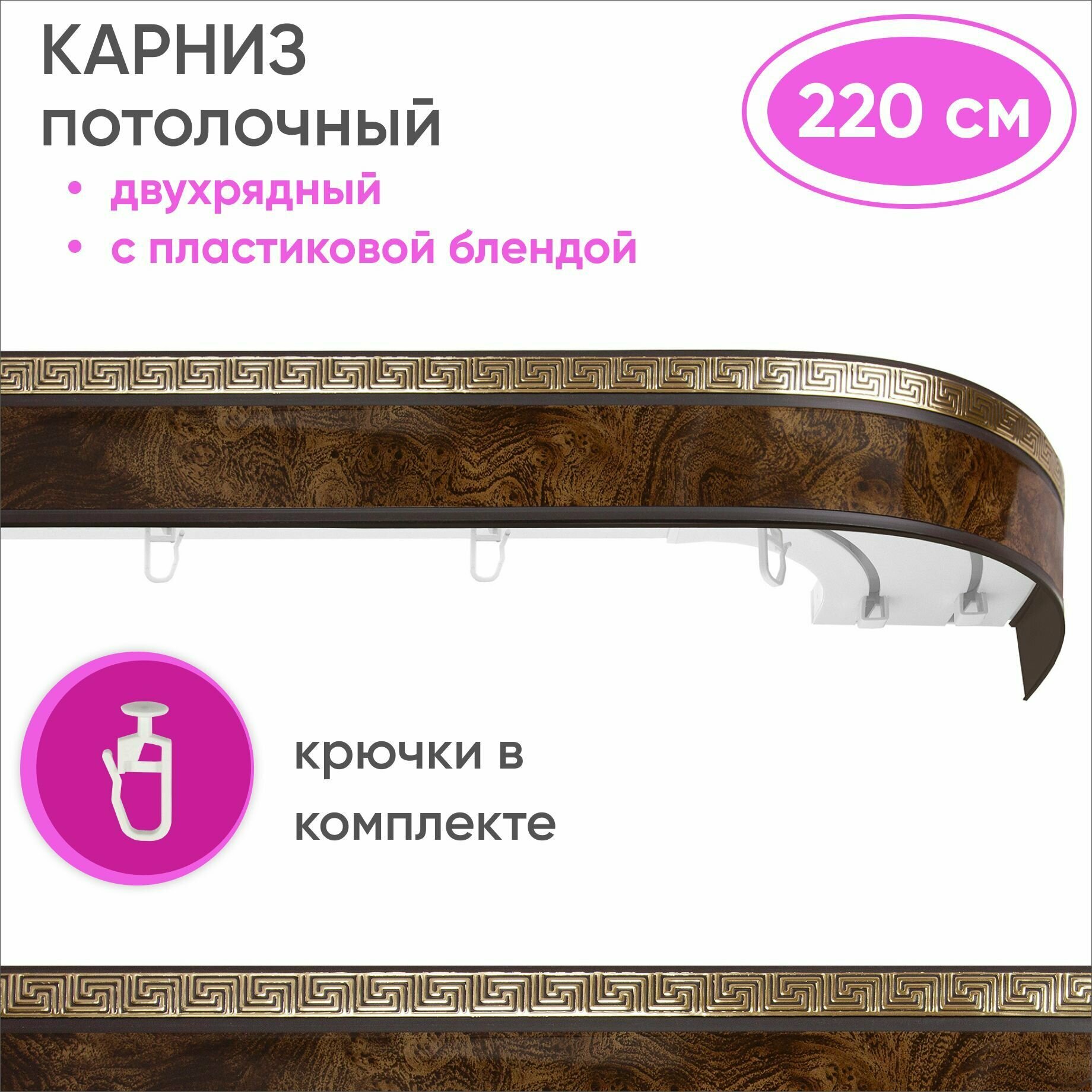 Купить Карниз для штор двухрядный потолочный с планкой 55мм, цвет: карельская береза 220см