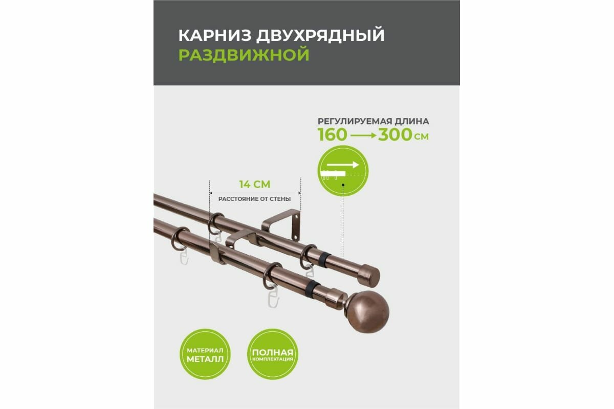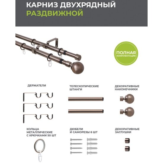 Карниз телескоп. 2-рядный Arttex 160-300см 16/19мм коньяк наконечник шар, арт.15.688