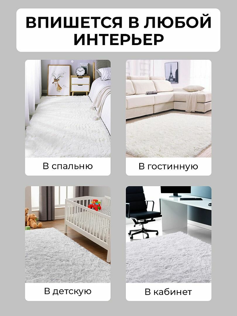 Купить Ковер на пол с ворсом Classmark комнатный, пушистый, 160х200 см, материал изделия 100% полиэстер, основа коврика ПВХ, мягкий и антискользящий, белый