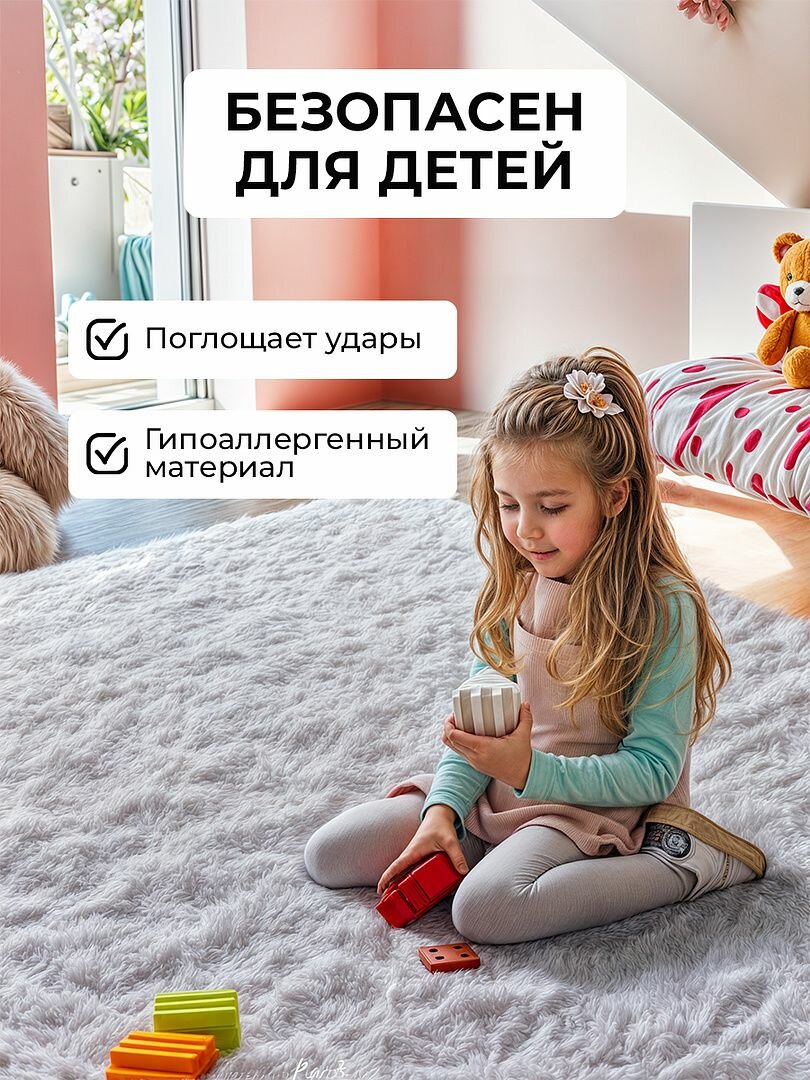 Ковер на пол с ворсом Classmark комнатный, пушистый, 120х160 см, материал изделия полиэстер, основа коврика ПВХ, мягкий и антискользящий, серый