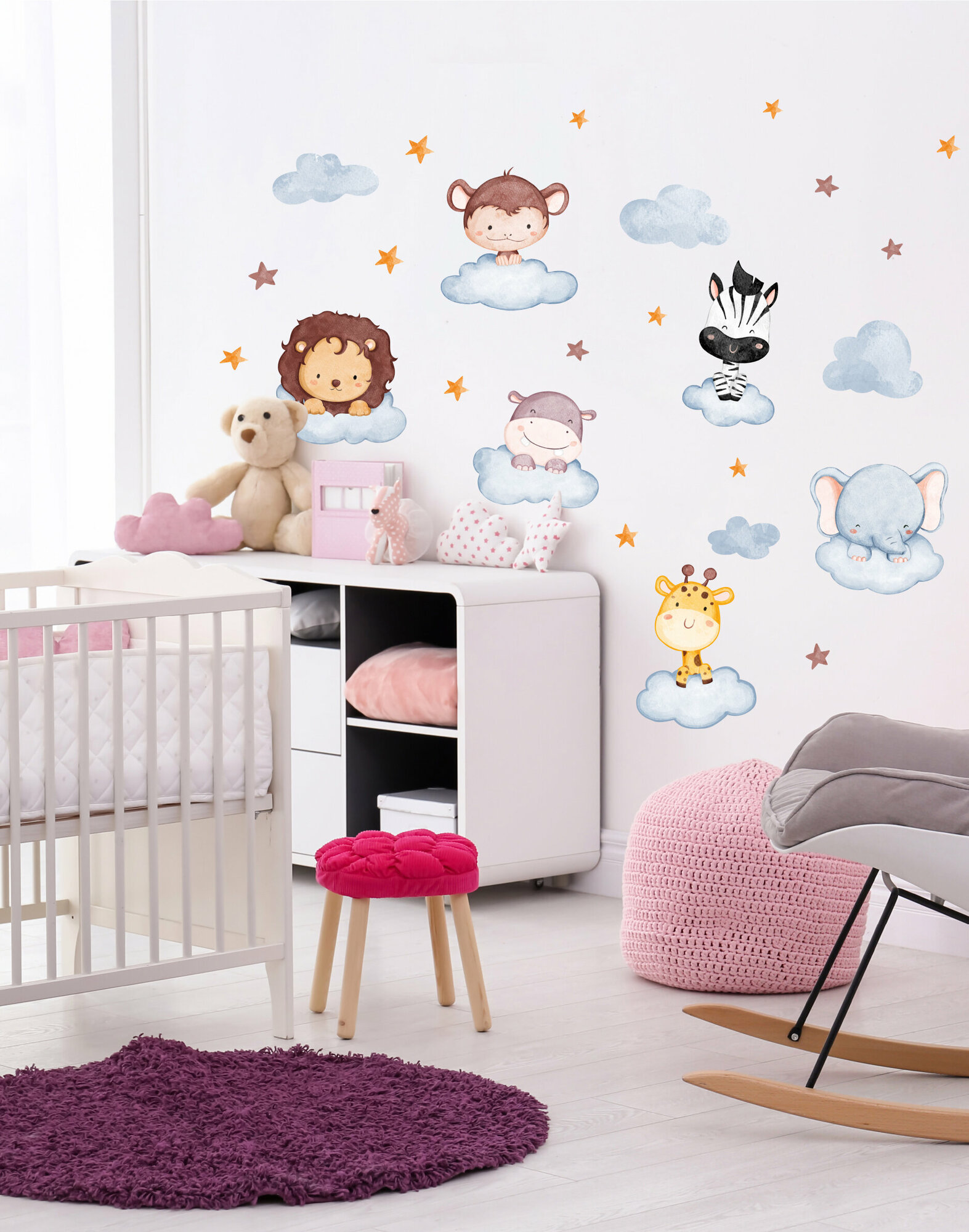 Купить Наклейки в детскую комнату интерьерные зверушки жираф, зебра, львенок, слон, бегемотик, обезьяна в облаках