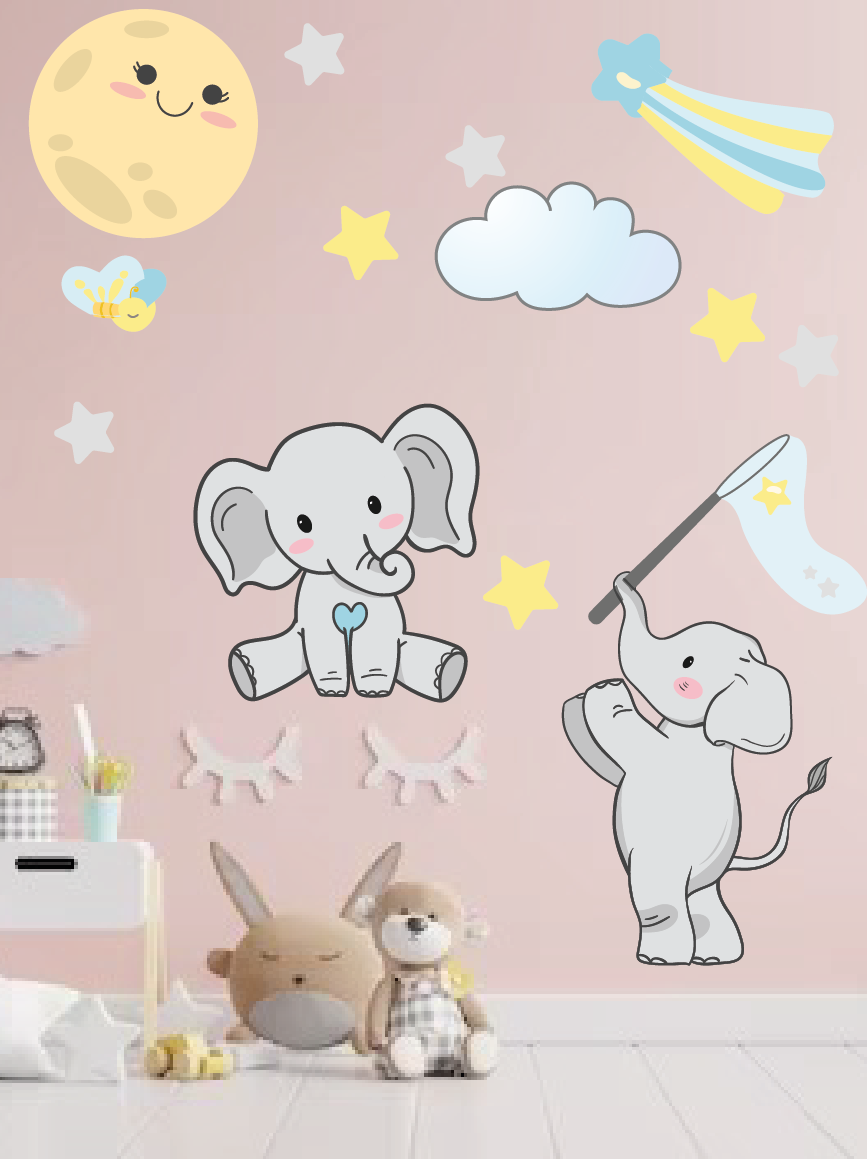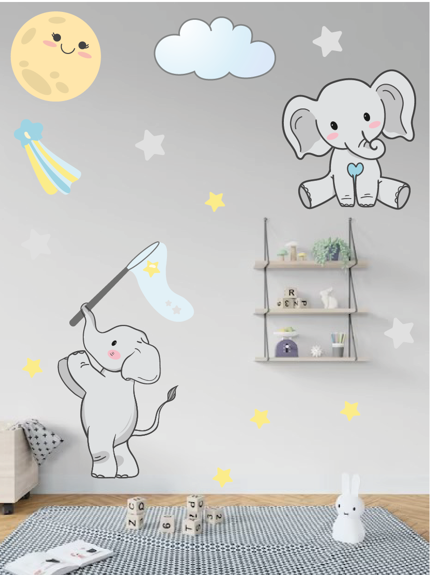 Большие интерьерна наклейки на стену в детскую / спальню / детский сад слоник ловит звездочки