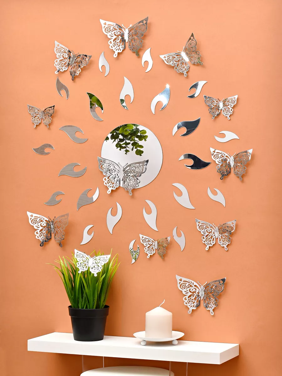 Купить Наклейки на стену для декора INFINITY интерьер, зеркальные наклейки на стену, солнце серебро +бабочка серебро 12шт.
