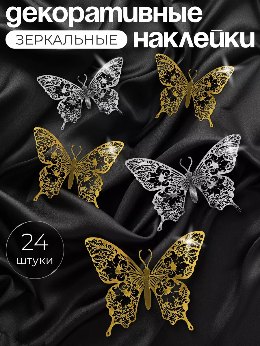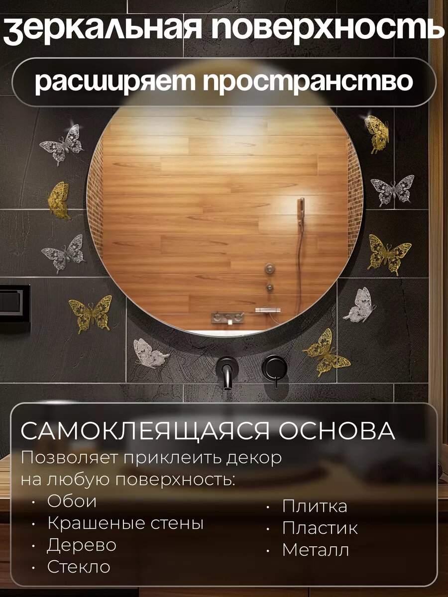 Наклейки на стену для декора INFINITY интерьер, зеркальные наклейки на стену, солнце серебро +бабочка серебро 12шт.