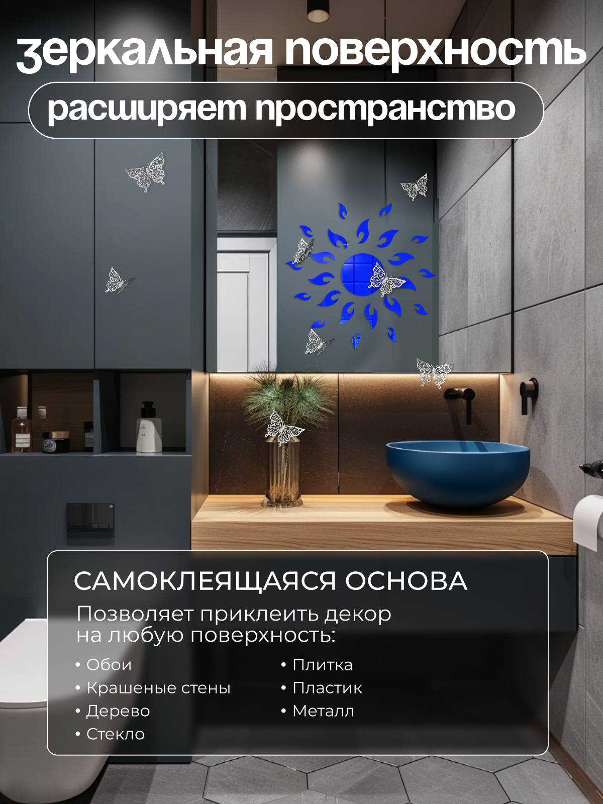 Купить Наклейки интерьерные зеркальные INFINITY интерьер, декор на стену солнце синее+бабочка серебро 12шт.