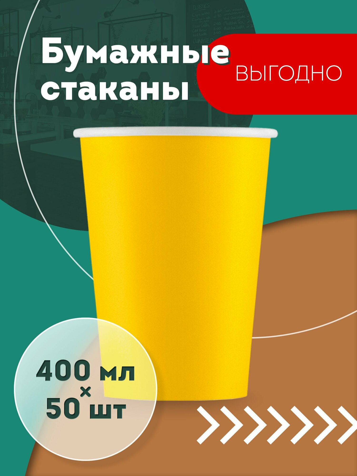 Набор одноразовых бумажных стаканов, 400 мл, 50 шт, жёлтый, однослойные; для кофе, чая, холодных и горячих напитков интересное: