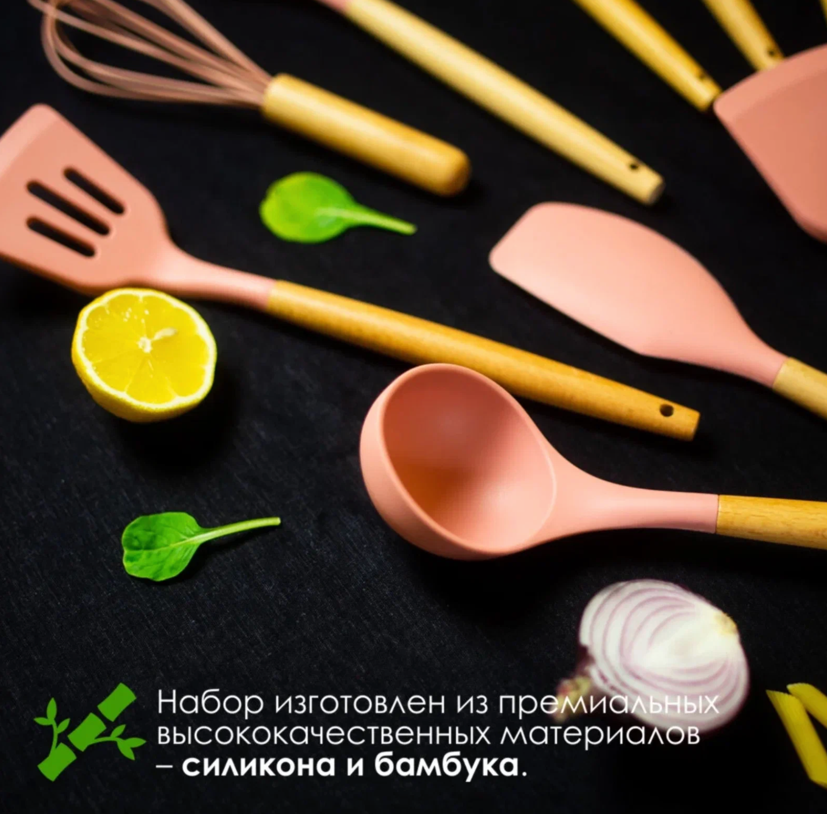 Набор кухонных принадлежностей Kitchen set из силикона и бамбука розовый