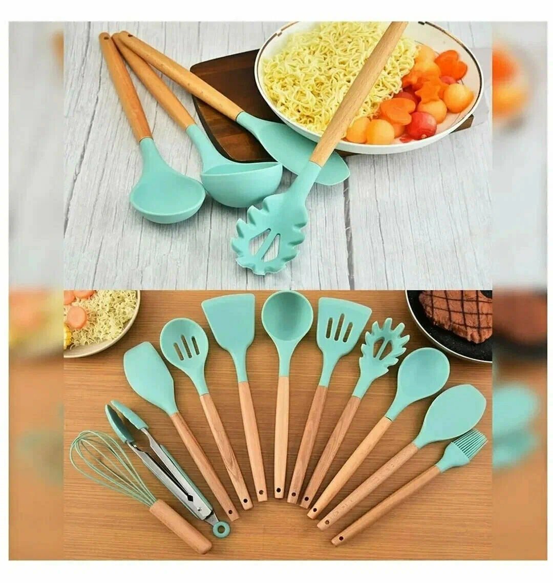 Кухонный набор Kitchen Set силикон и бамбук из 12 шт / цвет мятный.