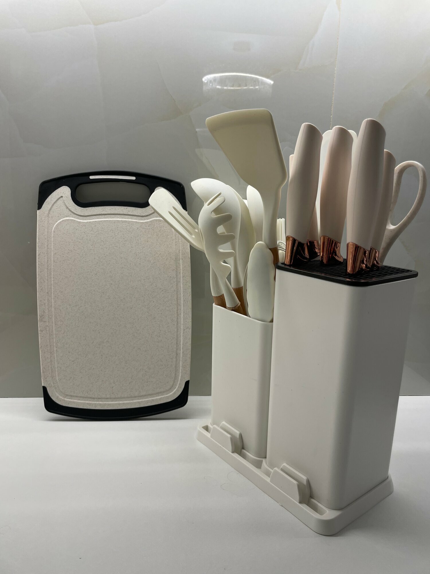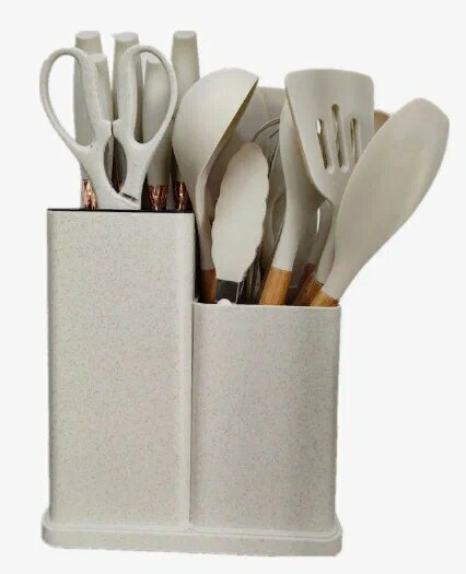 | Комплектация | Щипцы кухонные, лопатка кондитерская и лопаточка с отверстиями для жарки на сковороде, ложка для спагетти, ложка для салата, ложка для выпечки, шпатель, половник, шумовка, венчик для взбивания, кисточка для масла, 5 ножей разного размера, разделочная доска и подставка для хранения приборов. |