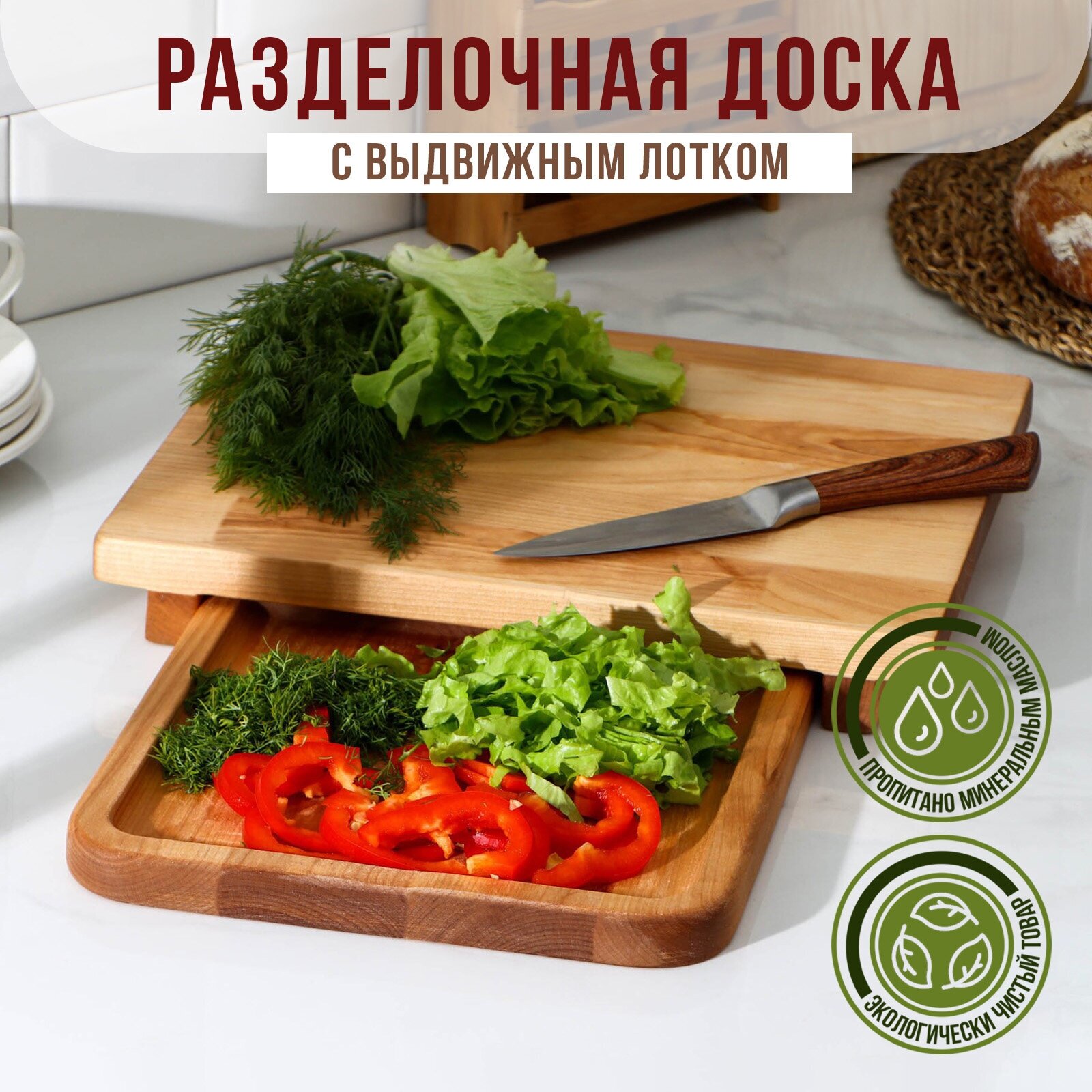 Доска разделочная с выдвижным лотком, пропитано минеральным маслом, 30×24 см, лоток 22×22 см, берёза интересное: