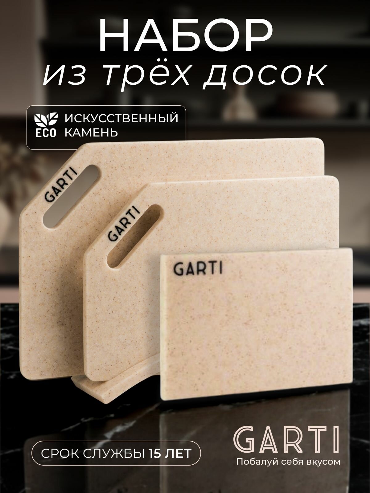 Garti Комплект из двух разделочных досок на подставке и мини доска цвет светло-коричневый материал искусственный камень размер 36*24 см, 30*20 см, 17*12,5 см Solid. surface