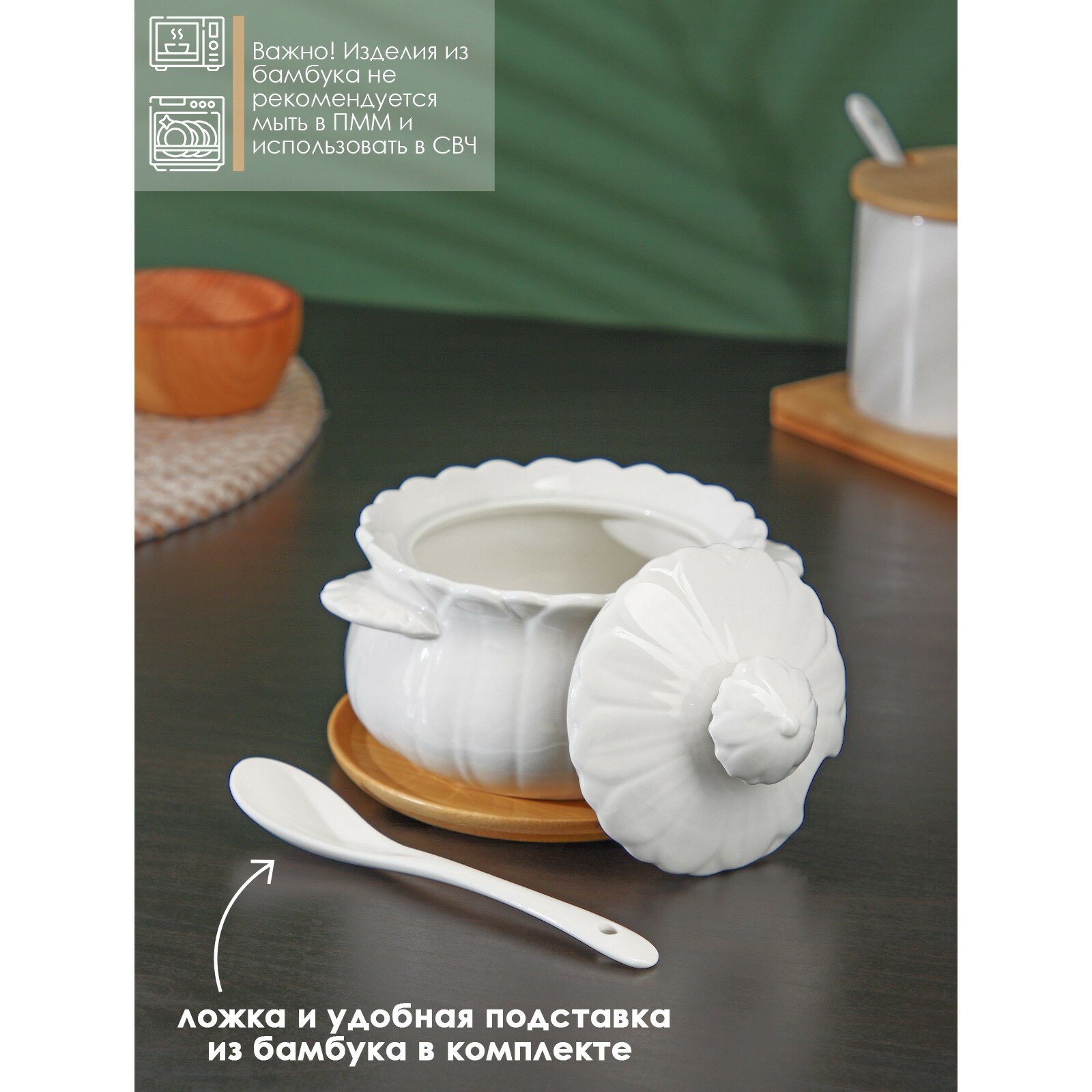 Купить Сахарница фарфоровая с ложкой на деревянной подставке BellaTenero «Тюльпан», 350 мл, цвет белый