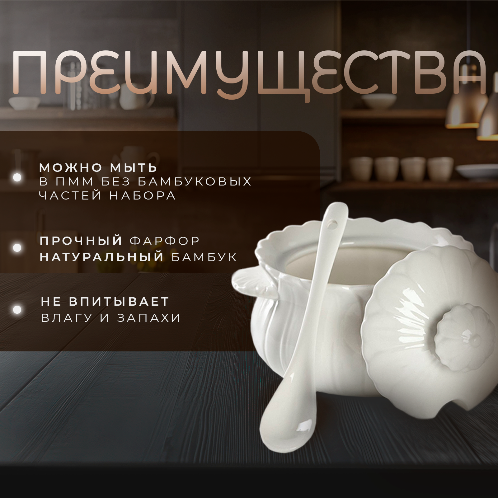 Сахарница фарфоровая с крышкой и ложкой на деревянной подставке BellaTenero, 250 мл