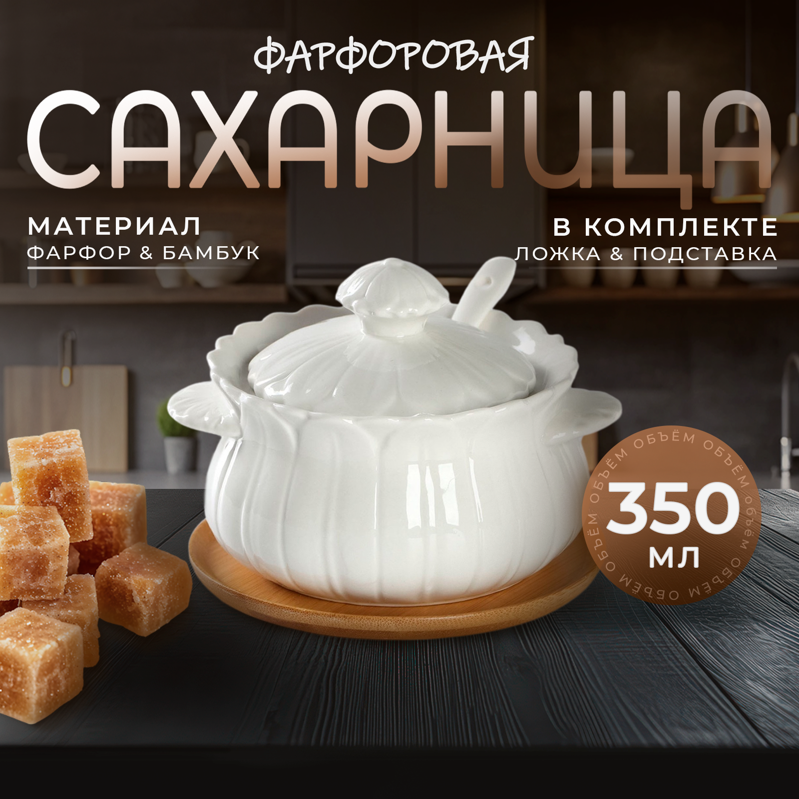 | Комплектация | Сахарница с ложкой – 350 мл, Подставка |