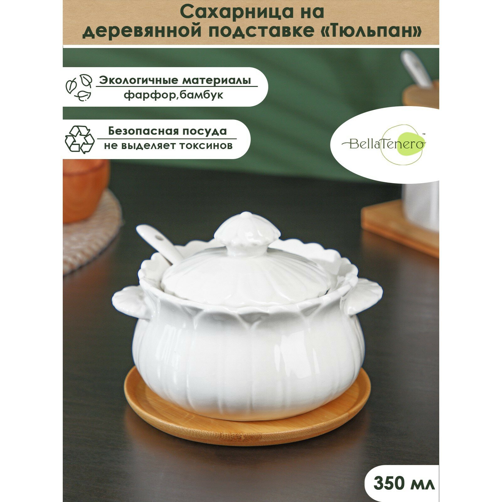 Сахарница фарфоровая с крышкой и ложкой на деревянной подставке BellaTenero «Тюльпан», 350 мл