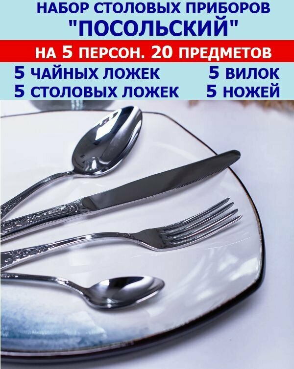 Купить Набор столовых приборов "Посольский" из 20 предметов на 5 персон (ложки столовые и чайные, вилки, ножи), Павловский завод им.Кирова.