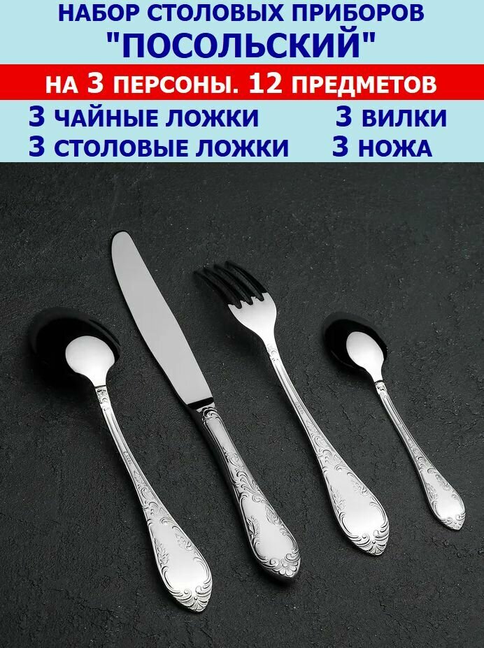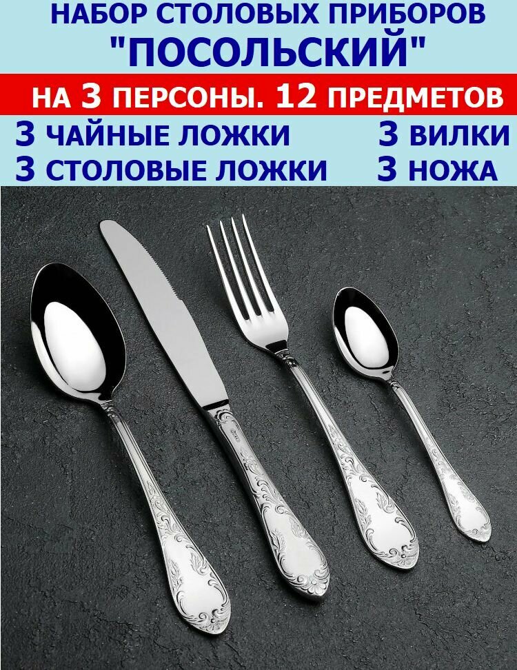 Купить Набор столовых приборов "Посольские" из 12 предметов на 3 персоны (ложки столовые и чайные, вилки, ножи), Павловский завод им.Кирова.
