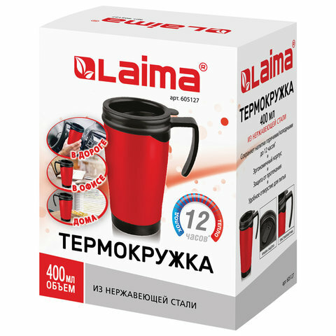 Купить Термокружка лайма LAIMA, 400 мл, нержавеющая сталь, пластиковая ручка, красная 605127