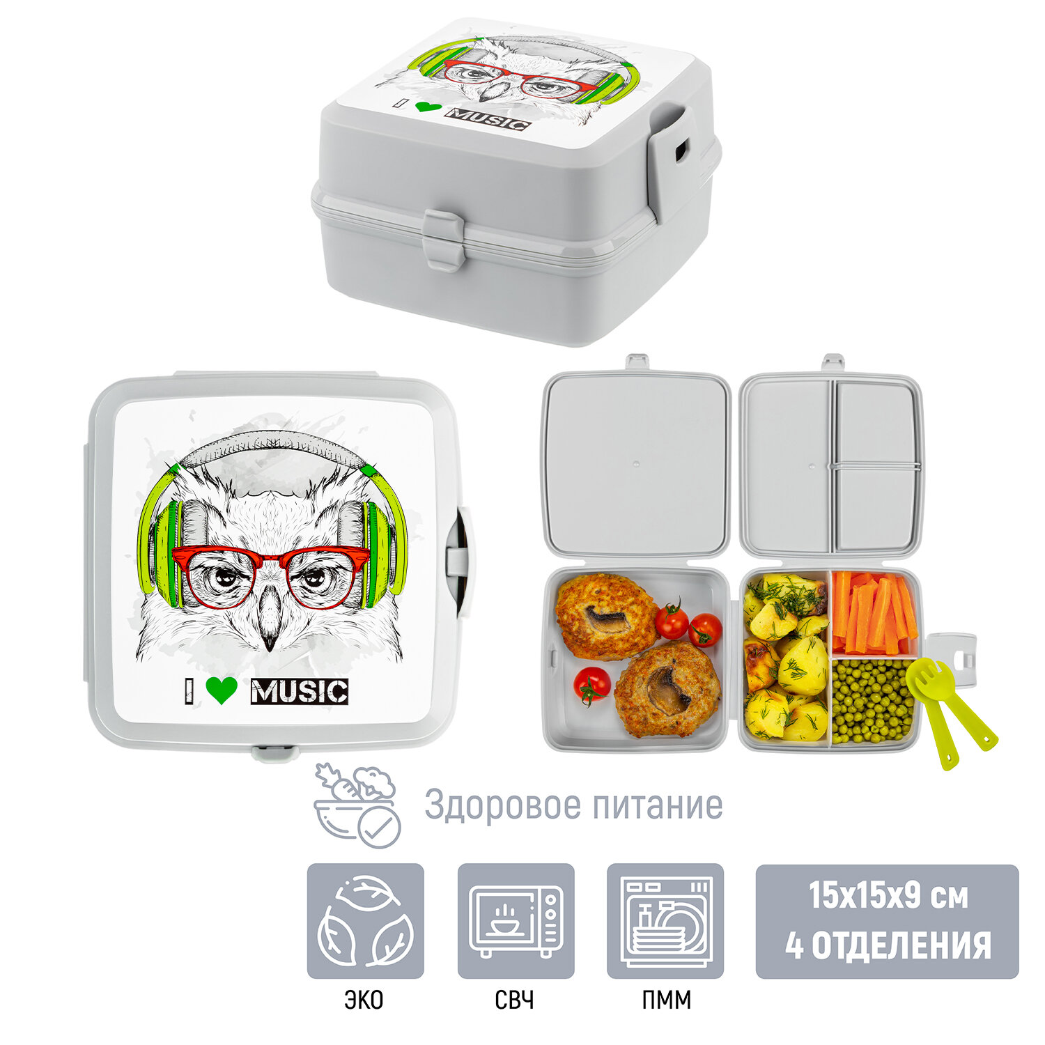 | Дополнительная информация | Ланч-бокс Бенто "Сова в наушниках" 15*15*9 см 1,2 л, серый, с вилкой и ложкой, 4 отделения (1 отделение - 14*14*4 см, 1 отделение - 14*7*4 см, 2 отделения - 7*7*4 см (модель 487) |
