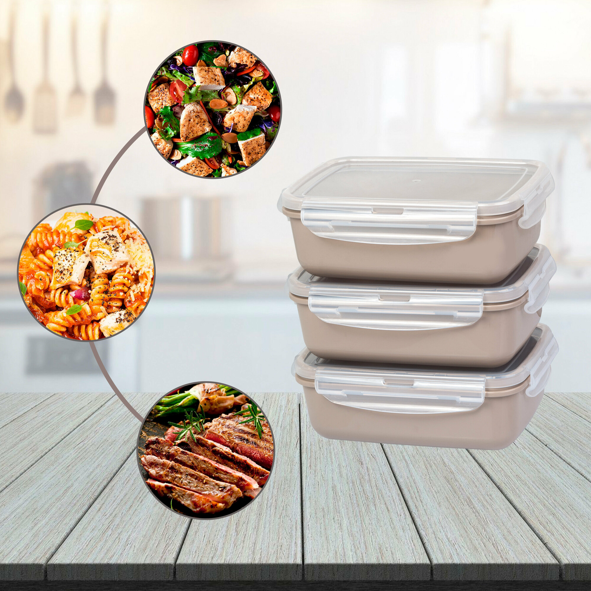 FSYA046 Контейнеры для еды YUDELI 1300 мл, 3 шт, цвет капучино, герметичные ланч-боксы с крышками на защелках