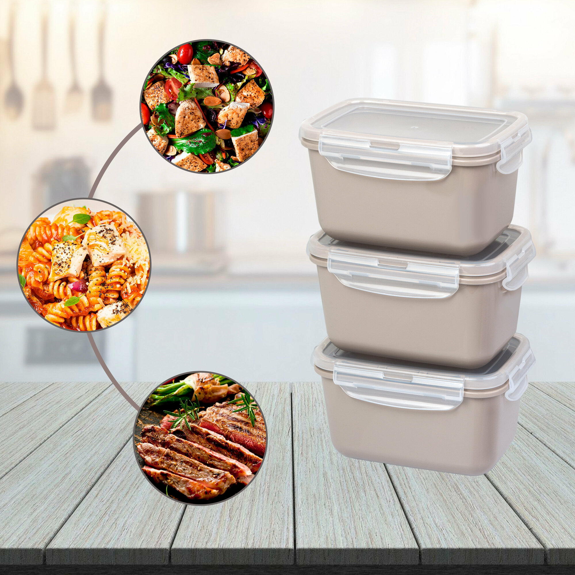 FSYA046 Контейнеры для еды YUDELI 1300 мл, 3 шт, цвет капучино, герметичные ланч-боксы с крышками на защелках
