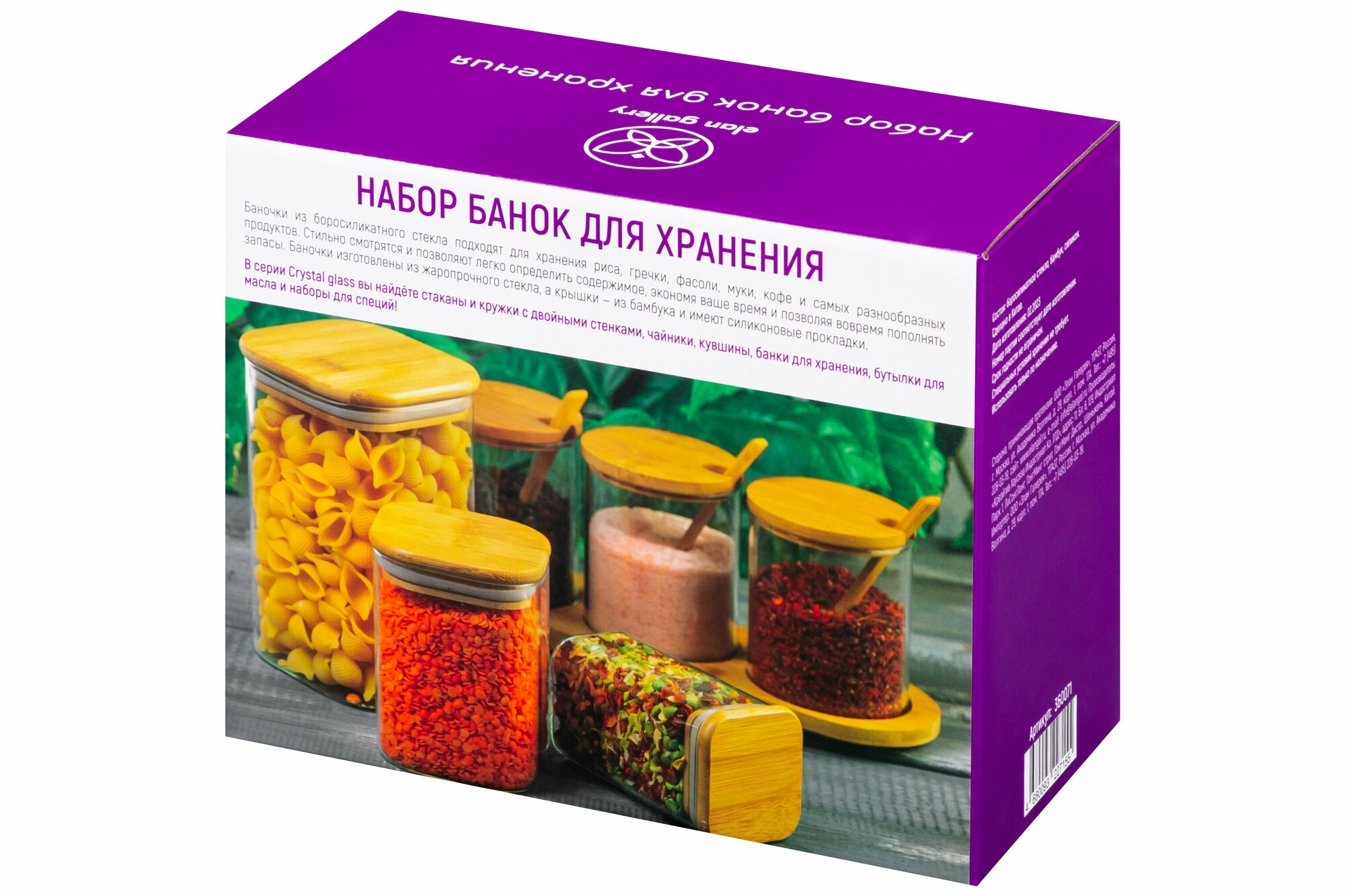 | Дополнительная информация | Набор 2 банок для хранения "Crystal glass" 10х10х15,5 см, 1,1 л - каждая, с бамбуковой крышкой с силиконовой прокладкой, высота без крышки - 15 см, боросиликатное стекло |