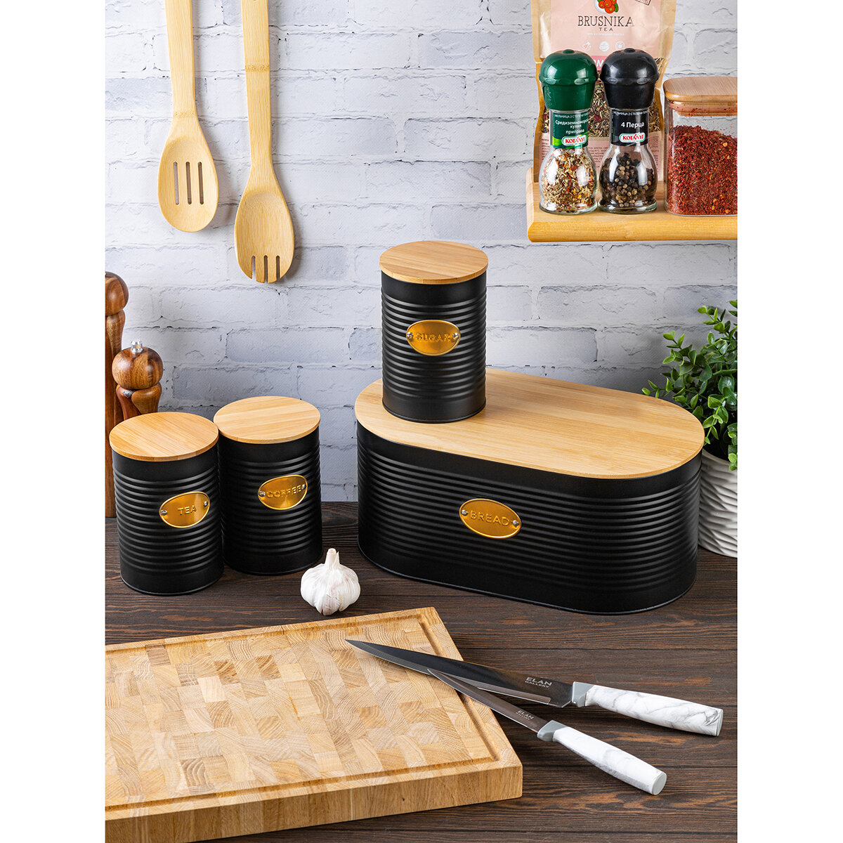 Набор 3 банок для сыпучих продуктов 900 мл 10*10*14,5 см "Tea, coffee, sugar" черный с бамбук.крышками интересное: