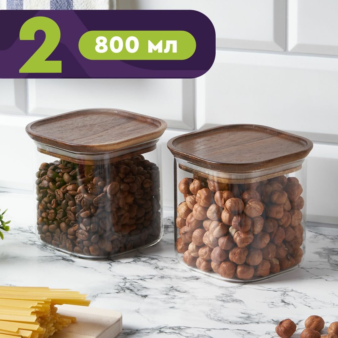 Набор банок 800мл для хранения еды и сыпучих продуктов из жаропрочного стекла Eley с крышкой из натуральной акации, 2шт