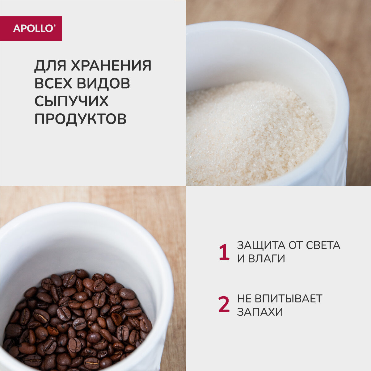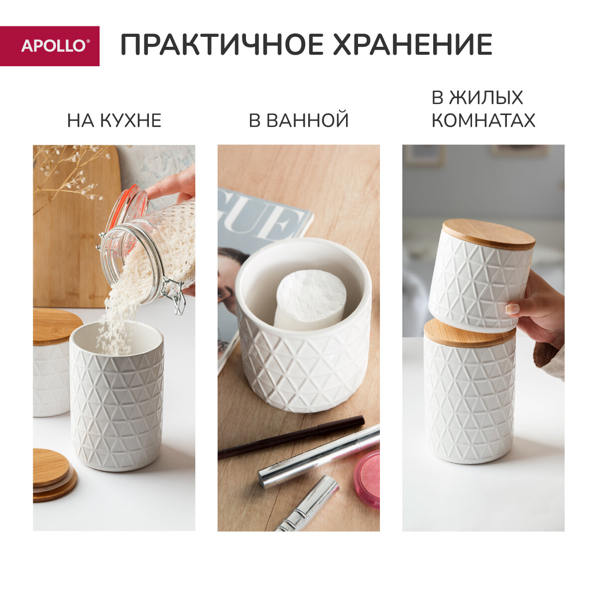 Банка для хранения сыпучих продуктов объём 0,7 л, керамическая с деревянной бамбуковой крышкой, контейнер для крупы APOLLO "Hold" белая интересное:
