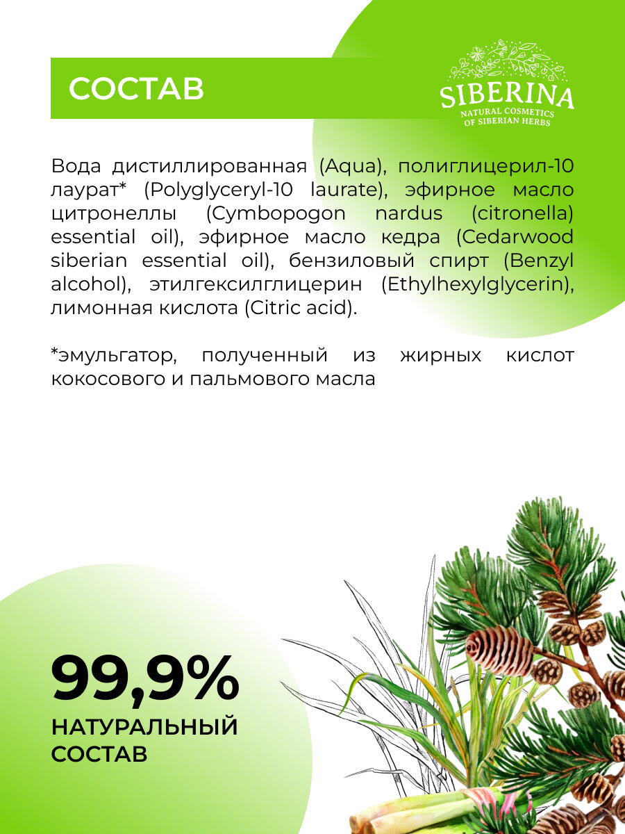 | Состав | Aqua (вода дистиллированная), Polyglyceryl-10 laurate* (полиглицерил-10 лаурат), Cymbopogon nardus (citronella) essential oil (эфирное масло цитронеллы), Cedarwood siberian essential oil (эфирное масло кедра), Benzyl alcohol (бензиловый спирт), Ethylhexylglycerin (этилгексилглицерин), Citric acid (лимонная кислота). * эмульгатор, полученный из жирных кислот кокосового и пальмового масла. |