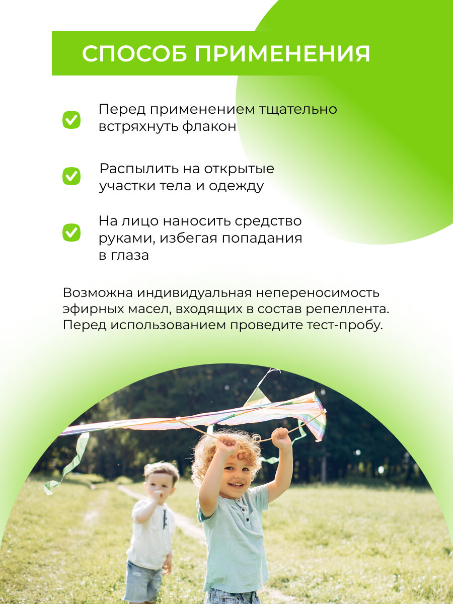 | Способ применения | Перед применением тщательно встряхнуть. Распылить на открытые участки тела и одежду. На лицо наносить средство руками, избегая попадания в глаза. Возможна индивидуальная непереносимость, провести тест-пробу. |