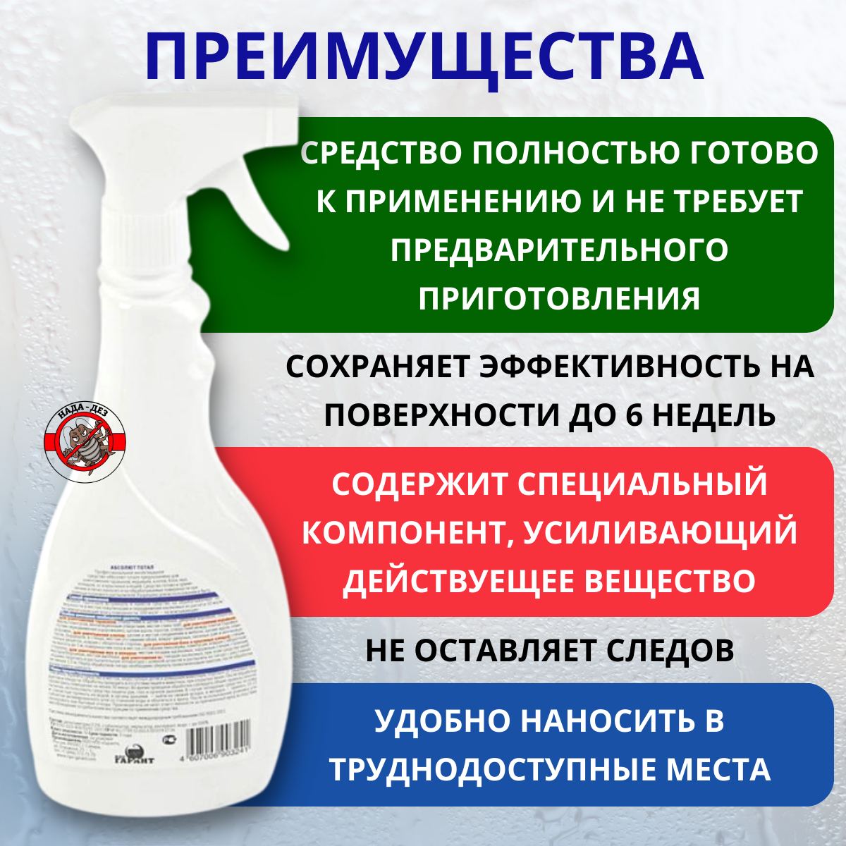 | Способ применения | Готовое к применению средство. Без запаха. Эффективность средства сохраняется до 6 недель. |