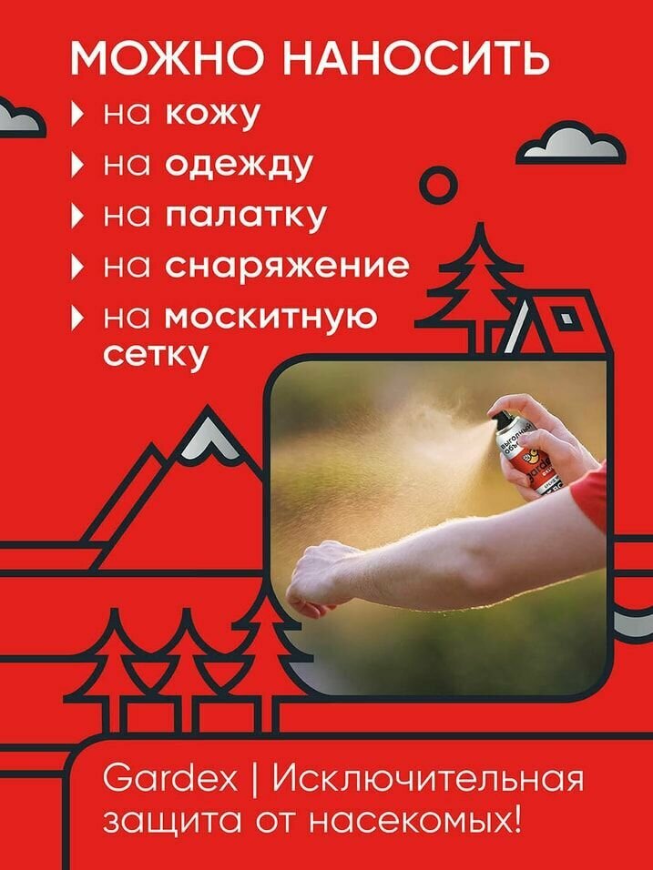 | Способ применения | Встряхнуть баллон перед применением. Обработку проводить на открытом воздухе. Для защиты от насекомых: распылить средство на ладонь и нанести, не втирая, на открытые участки тела. Можно наносить на одежду и снаряжение из натуральных тканей. После работы со средством тщательно вымыть руки с мылом. Для защиты от клещей: обрабатывать весь комплект одежды до легкого увлажнения, не надевать ее до полного высыхания. |