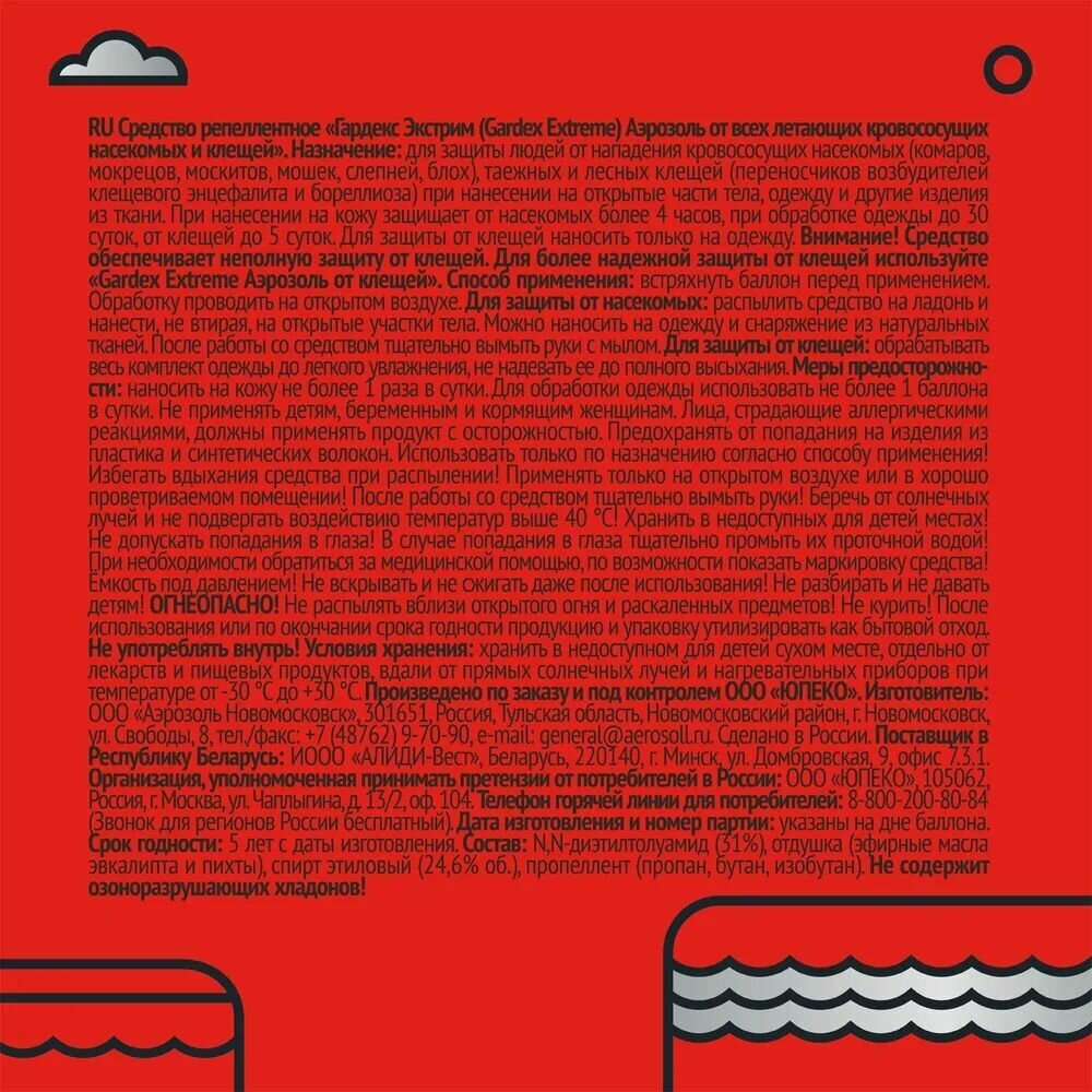 | Подробная комплектация | Аэрозоль от всех летающих кровососущих насекомых, Gardex Extreme, 200 мл |