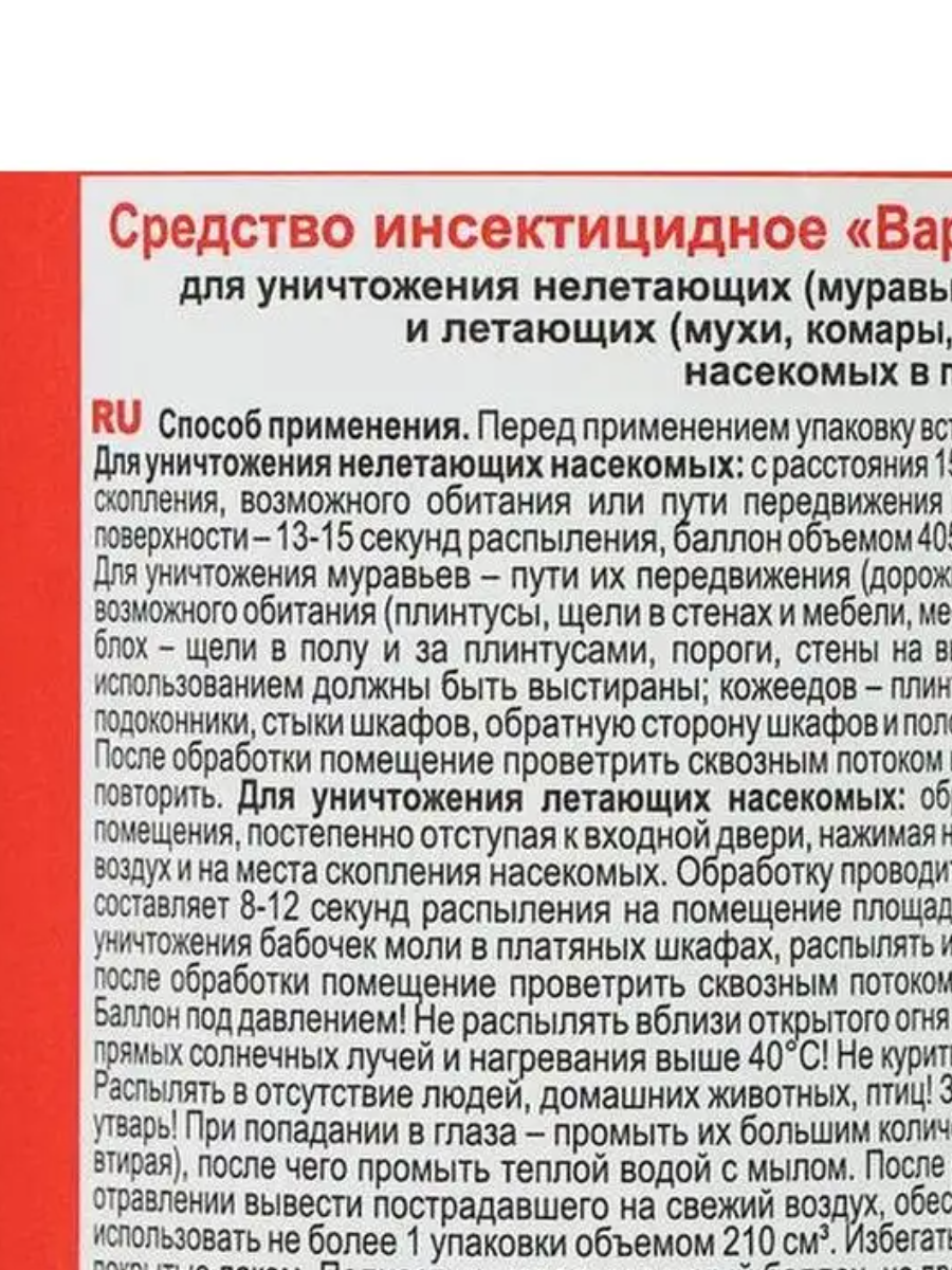 | Способ применения | Обработка от нелетающих насекомых: перед использованием баллон хорошо встряхнуть. Обработку проводить при открытых окнах и дверях. Струей аэрозоля с расстояния 15-20 см обработать возможные места обитания, скопления и передвижения насекомых: плинтуса, щели в стенах и мебели, места отхождение обоев, обратную сторону картин, ковров и другие места. Через 15 минут после обработки проветрить помещение в течение 30 минут, затем провести влажную уборку поверхностей, с которыми может соприкоснуться человек. Норма расхода: 20 г/м2 обрабатываемой поверхности, что соответствует 13-15 секундам распыления. При необходимости повторить обработку. |