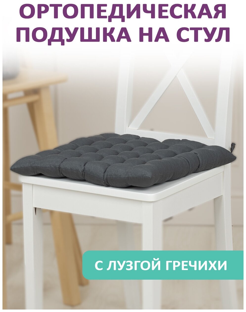 Ортопедическая подушка для сидения, подушка на стул с лузгой гречихи на завязках Bio-Line 40х40 см, серый