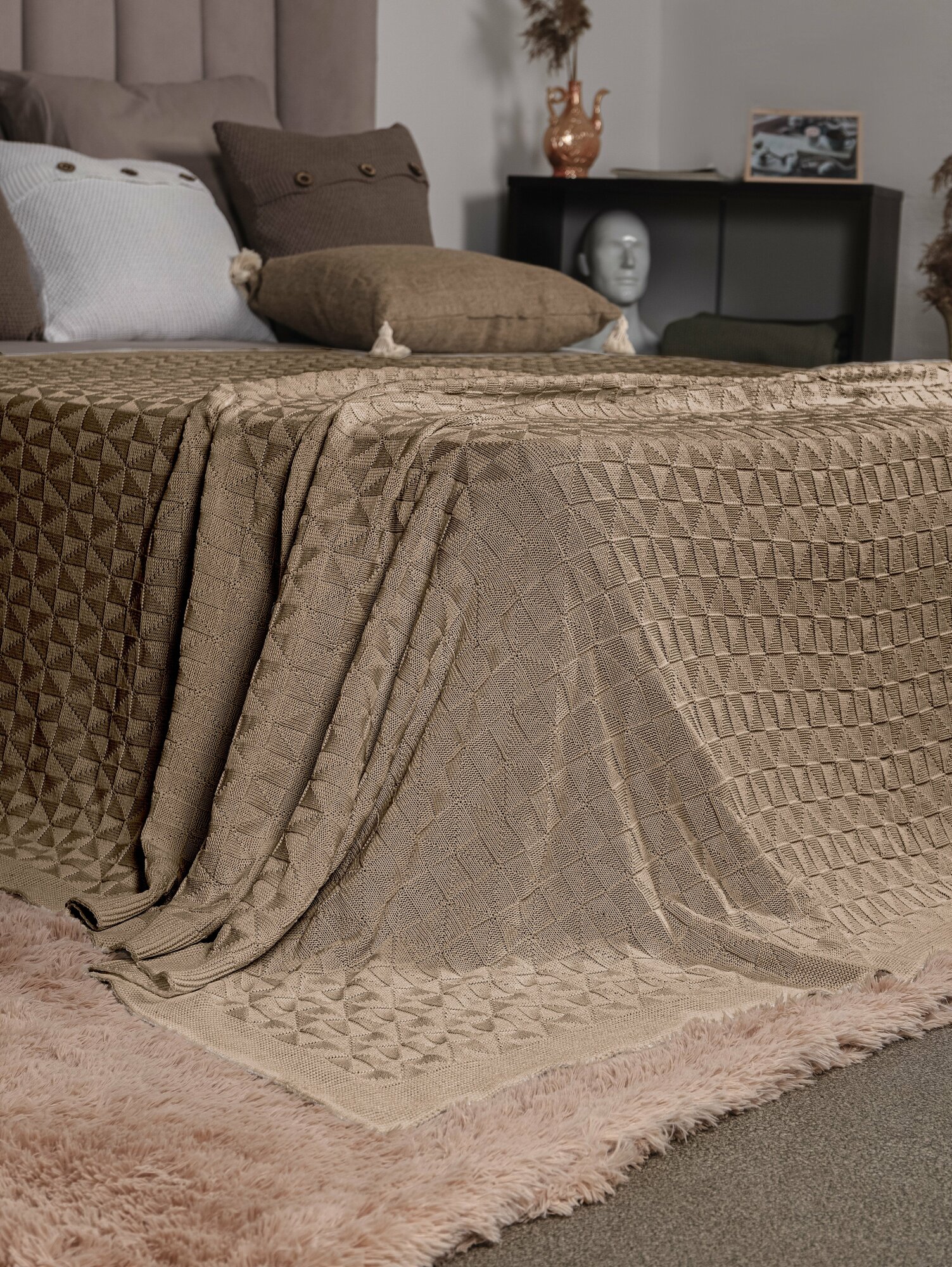 Плед 220х240, вязаный, покрывало на кровать, на диван, бежевый, KING PLAID, Хлопок 100%, в подарочной сумке