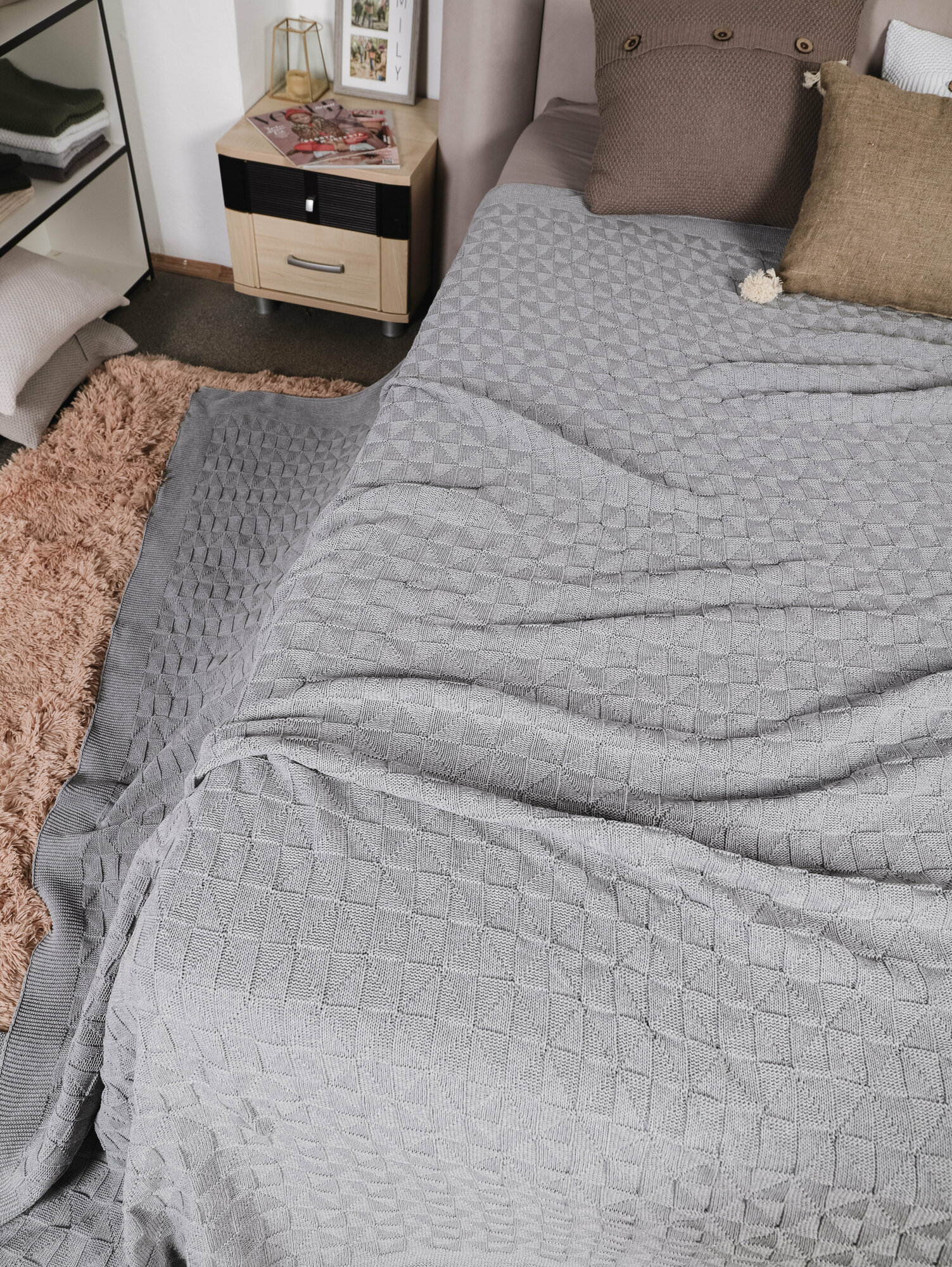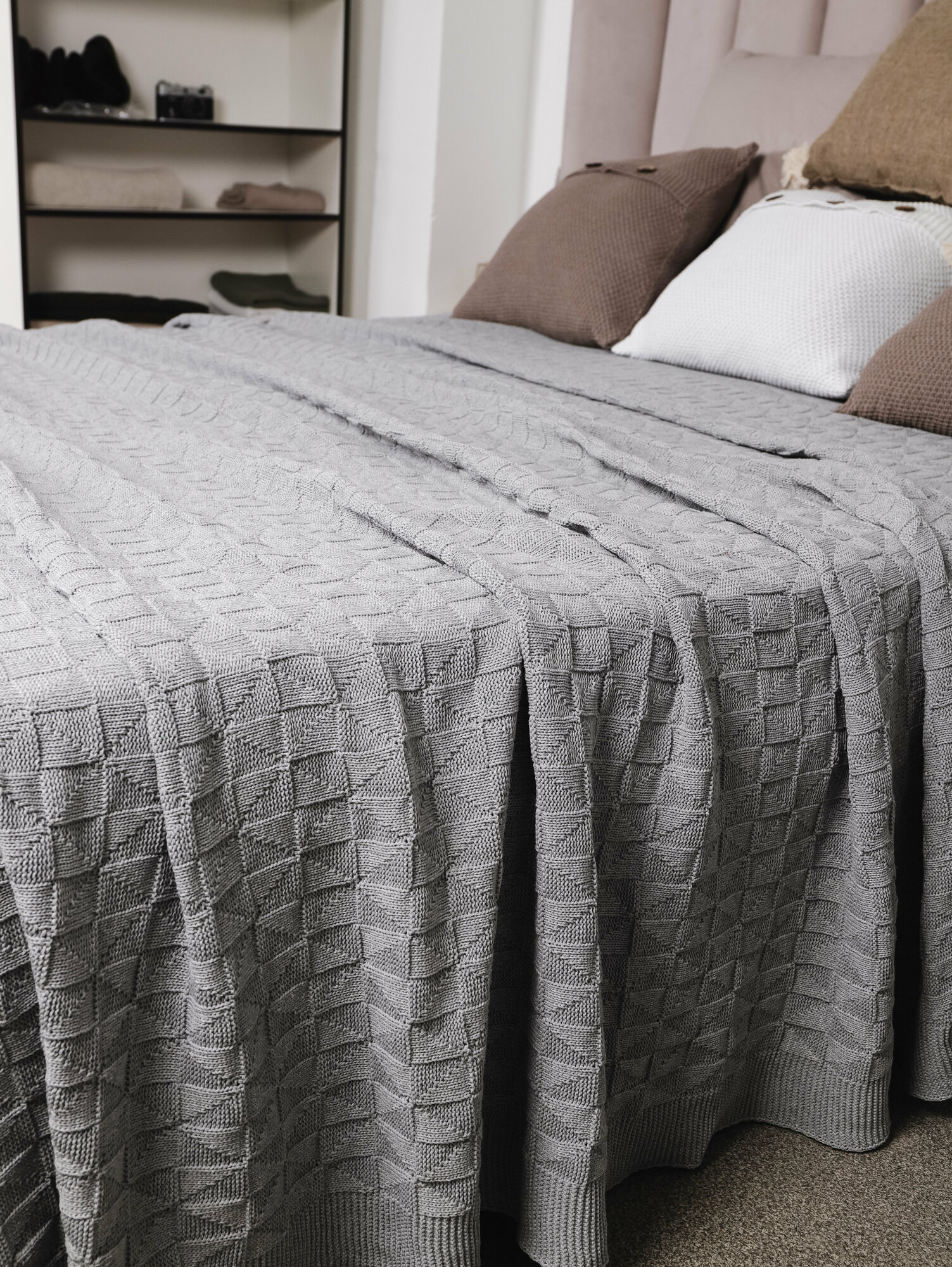 Плед 220х240, вязаный, покрывало на кровать, на диван, светло-серый, KING PLAID, Хлопок 100%, в подарочной сумке