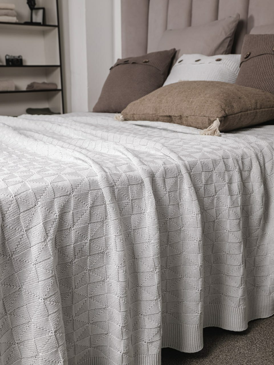 Плед 220х240, вязаный, покрывало на кровать, на диван, светло-серый, KING PLAID, Хлопок 100%, в подарочной сумке