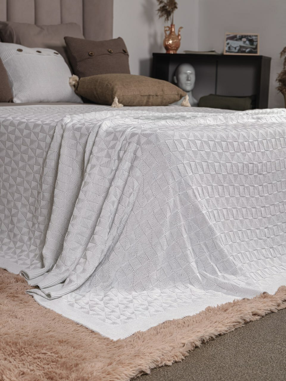 Плед 220х240, вязаный, покрывало на кровать, на диван, белый, KING PLAID, Хлопок 100%, в подарочной сумке