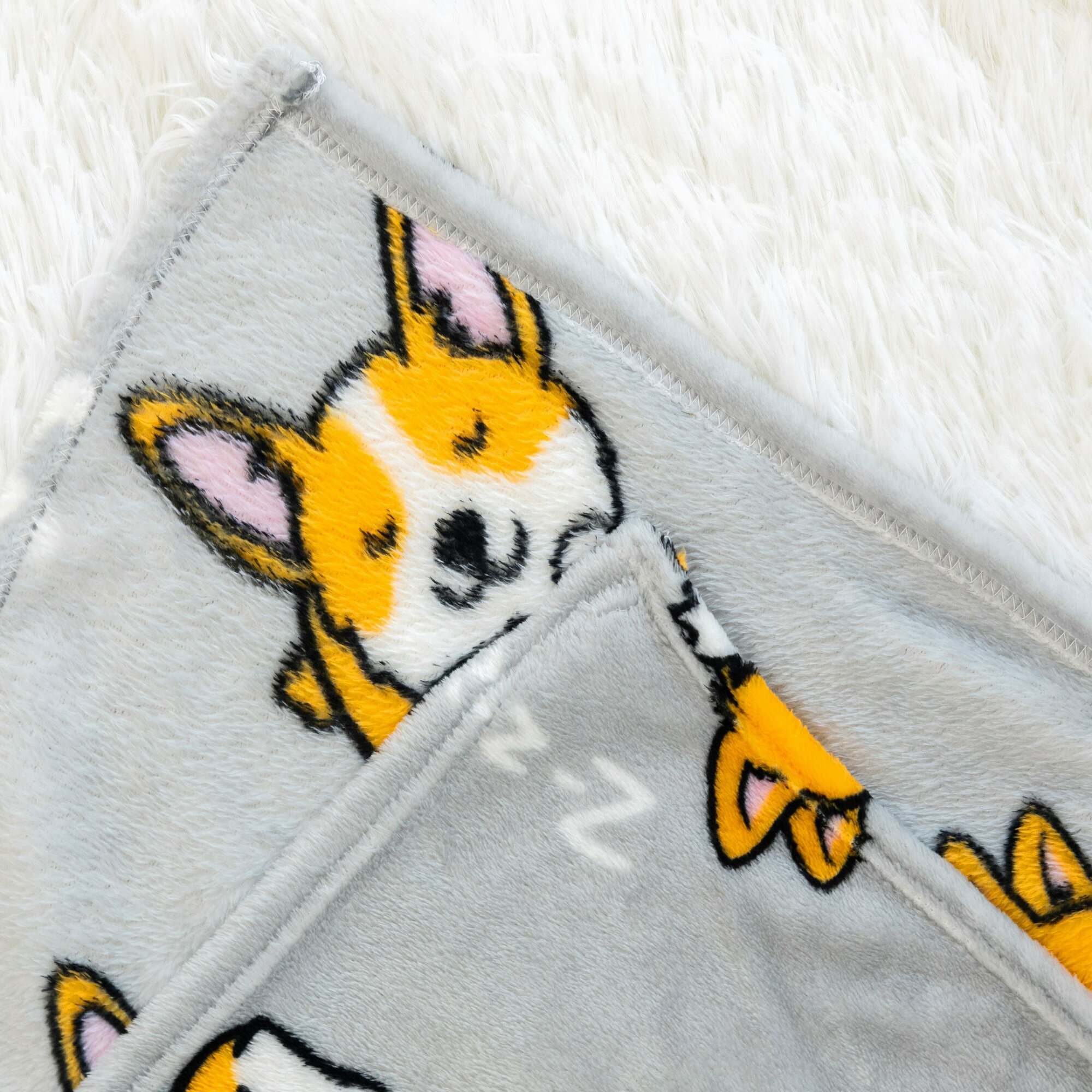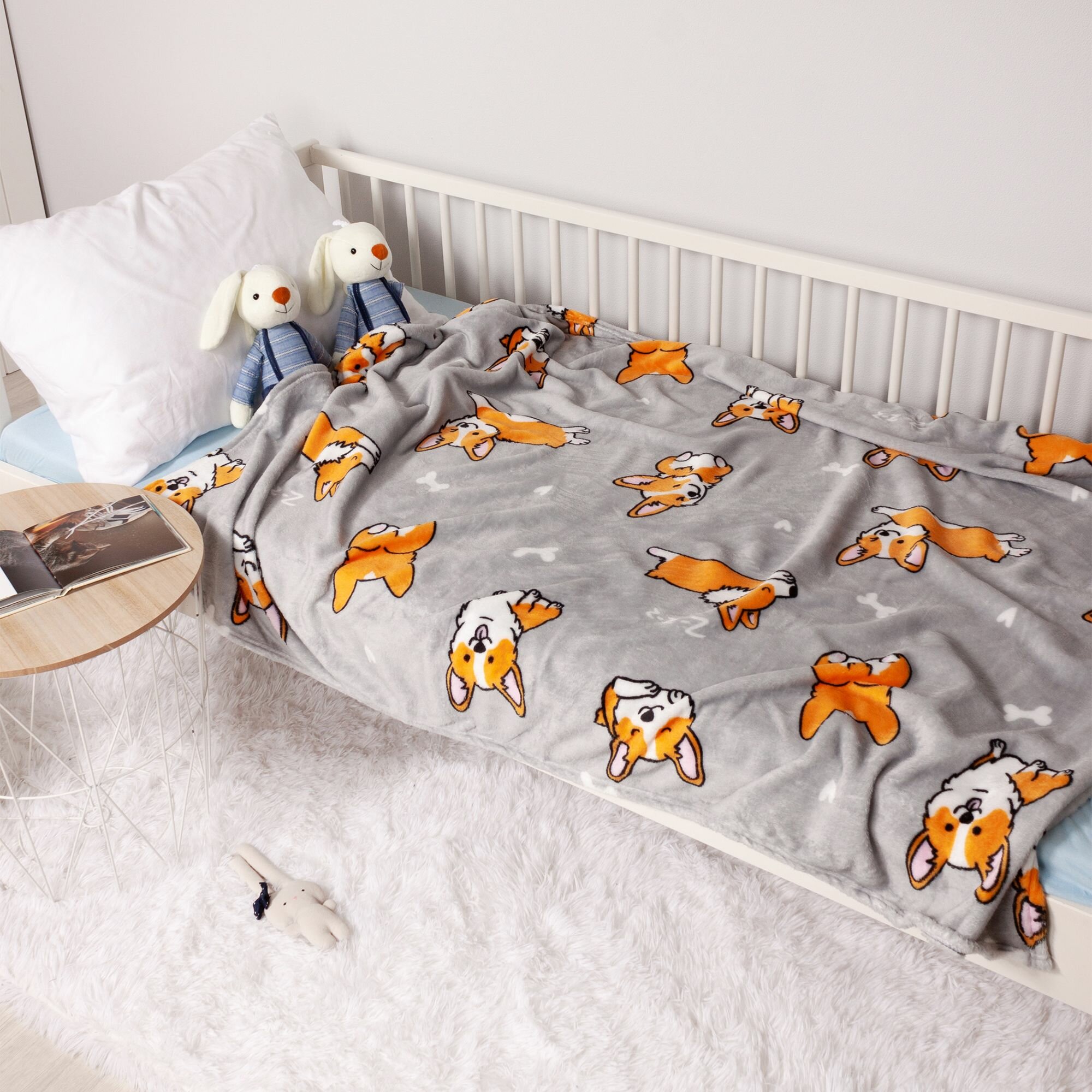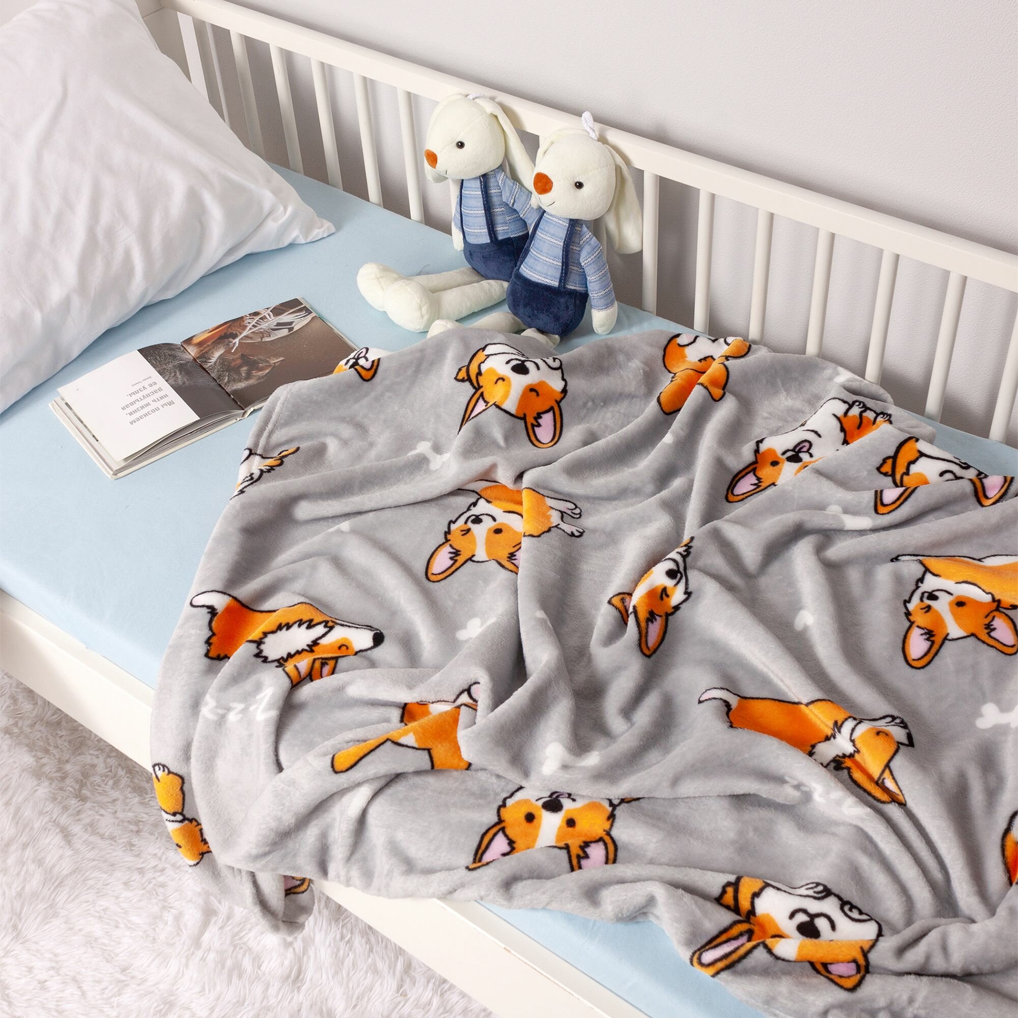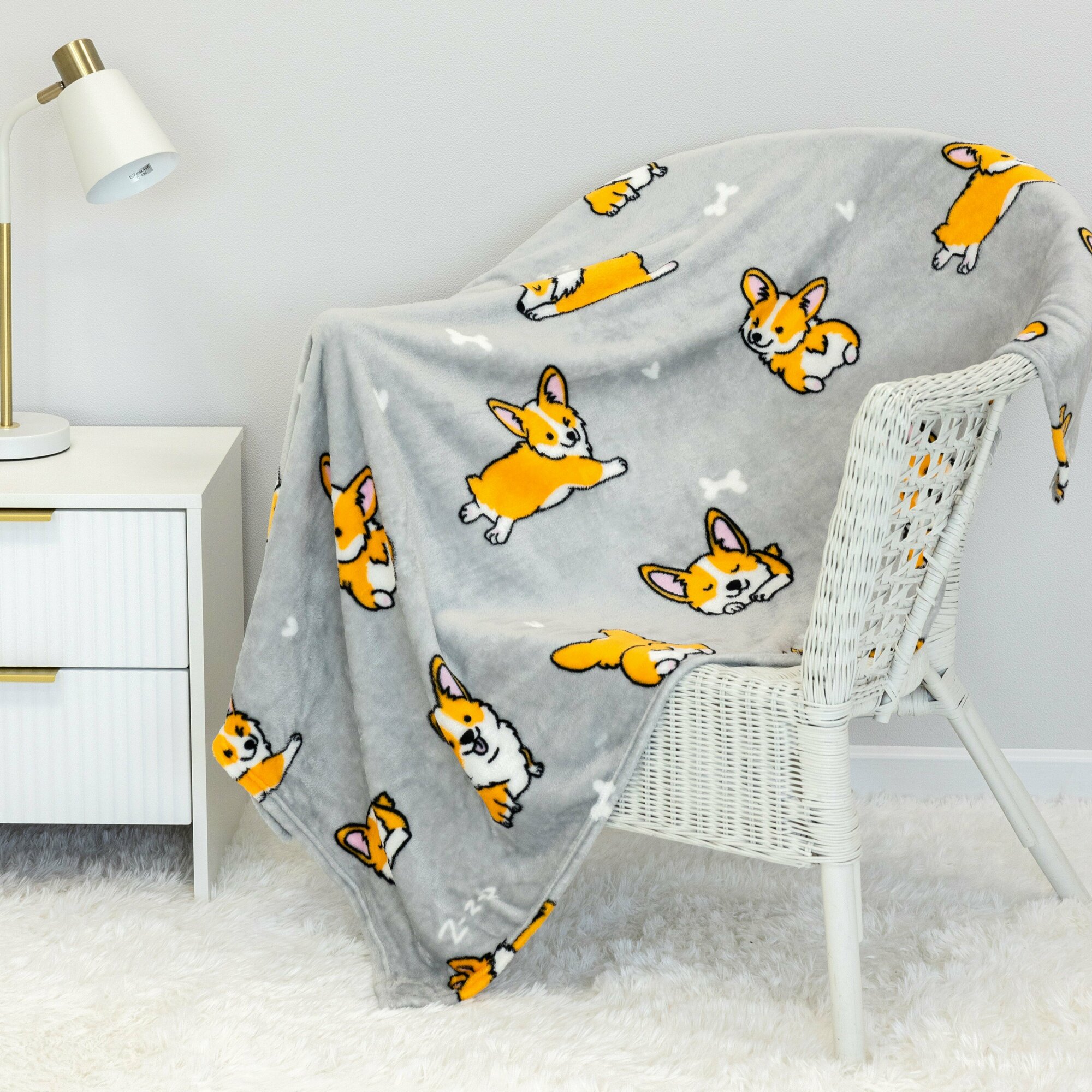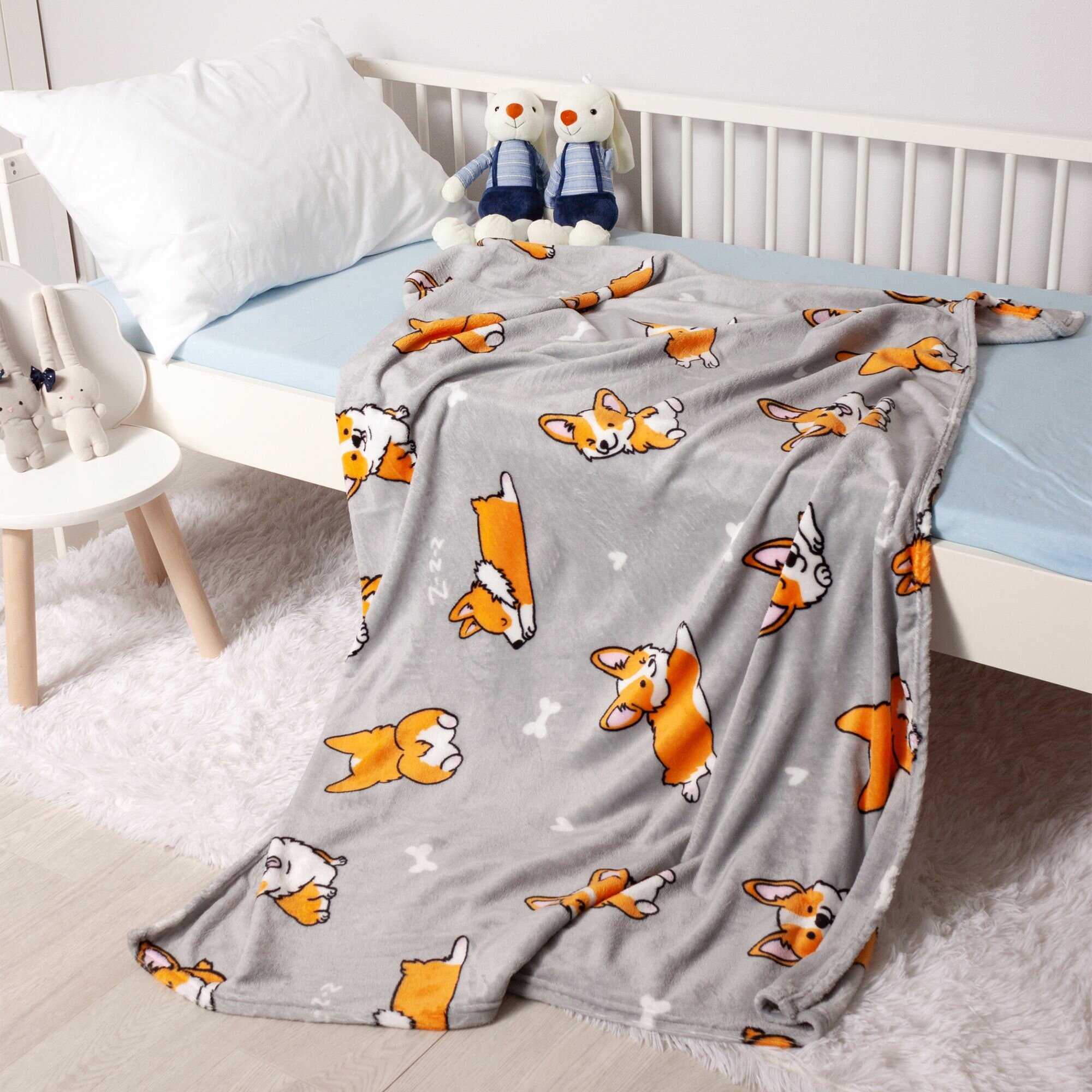 Купить Детский плед из микрофибры, 100 х 150 см, рисунок собачки корги, светло-серый